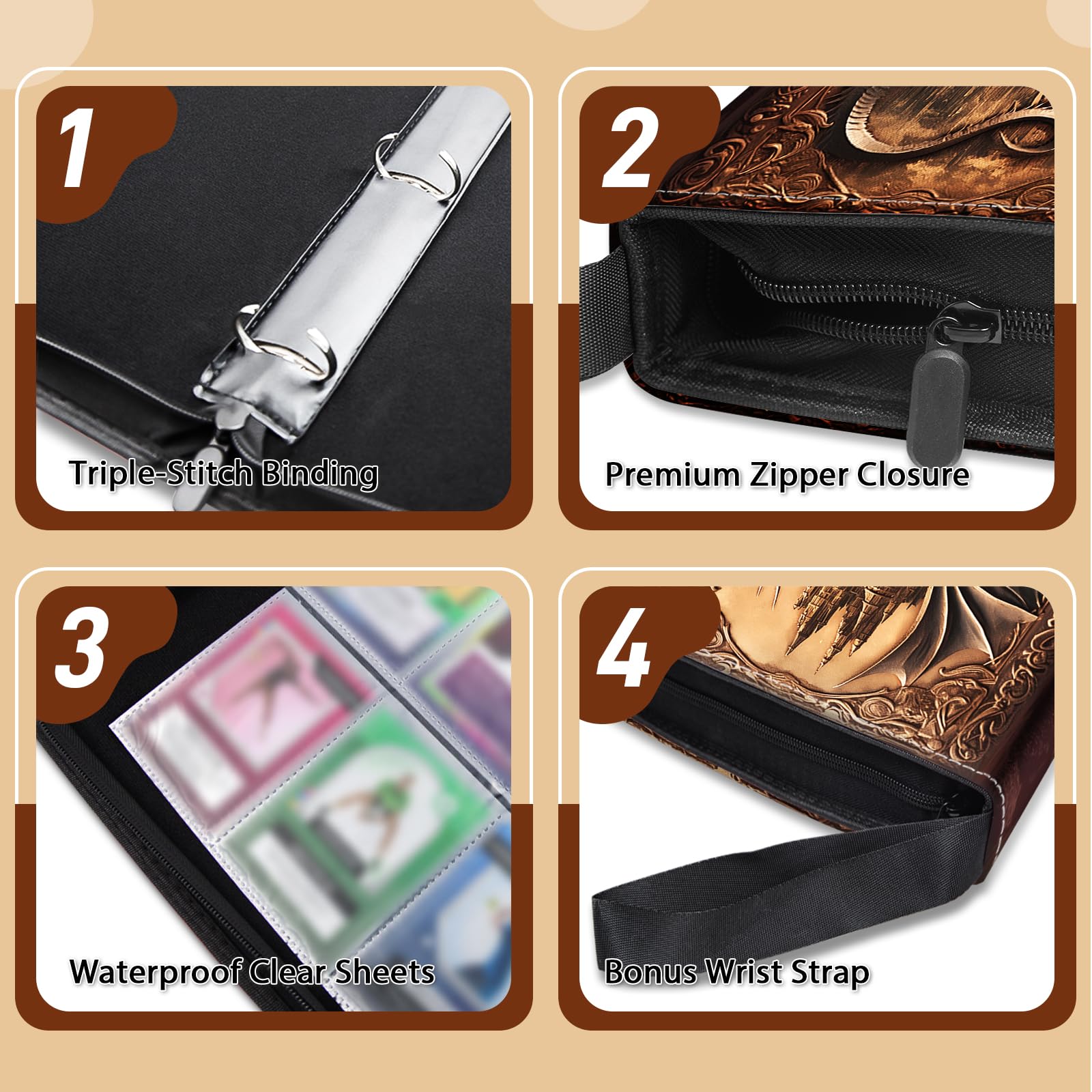 View compareWazzio 900 Pocket Trading Card Storage Album Card Binder with 50 Durable 9-Pocket Pages Birthday Gifts for Fathers Day Retro Dragon Design on Pocket Card Packs Gifts for Zipper Closure Collector