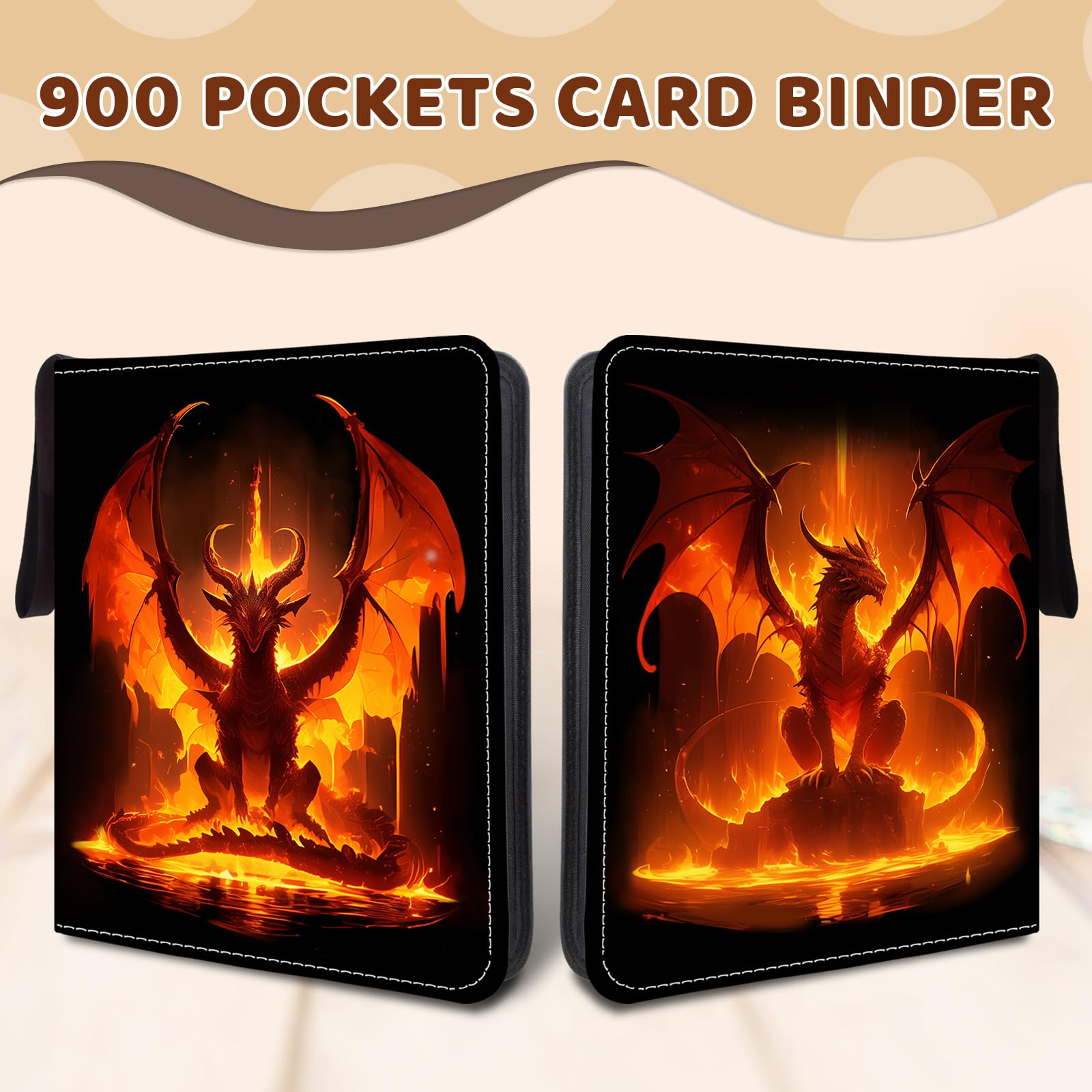 Wazzio 900 Pocket Trading Card Storage Album Card Binder with 50 Durable 9-Pocket Pages Fire Dragon Design on Pocket Card Packs Gifts for Zipper Closure Collector's Album