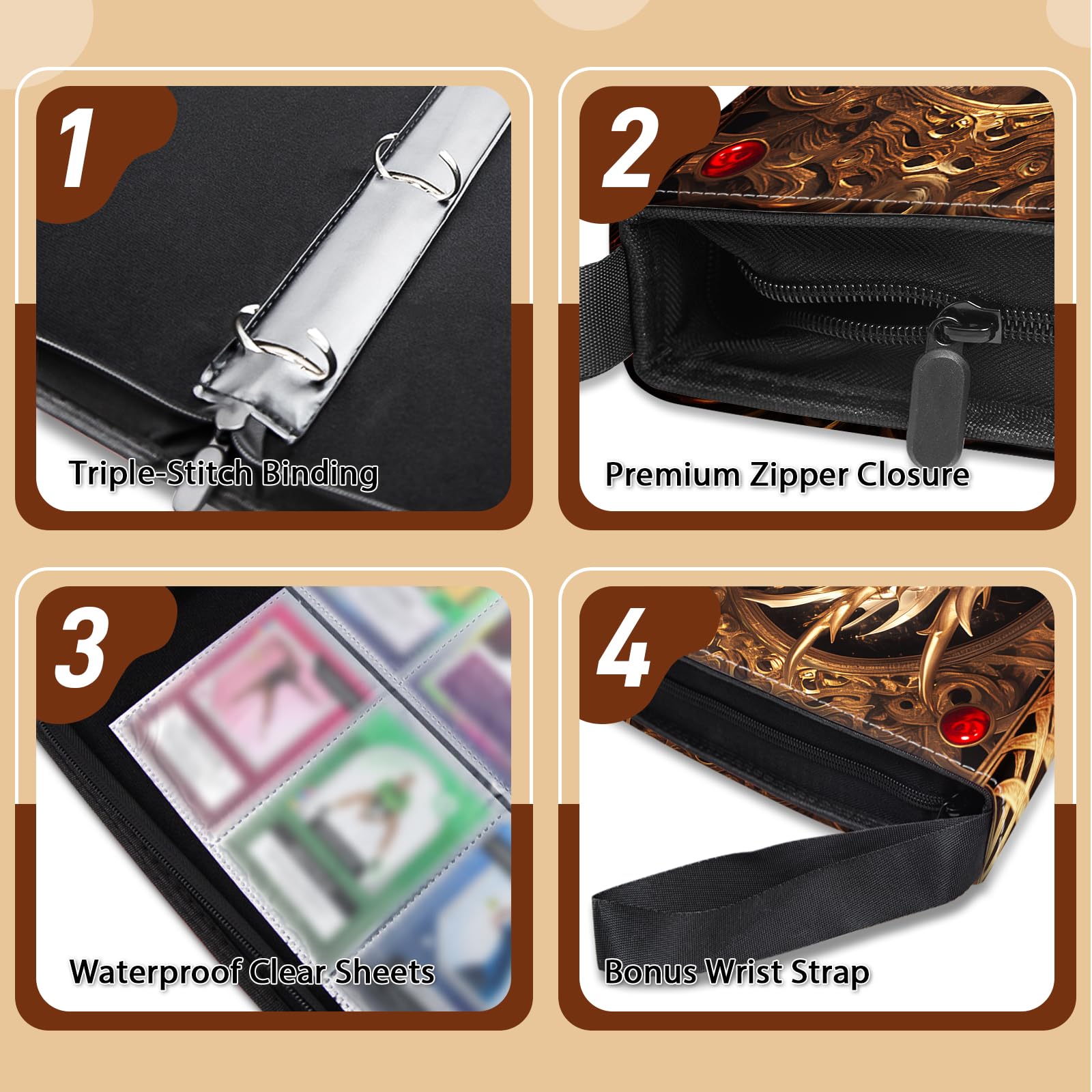 View compareWazzio Trading Card Storage Album with 50 Durable 9-Pocket Pages Birthday Gifts for Fathers Day 900 Pocket Card Binder Gifts for Collector's Album Golden Dragon Design on Pocket Card Packs
