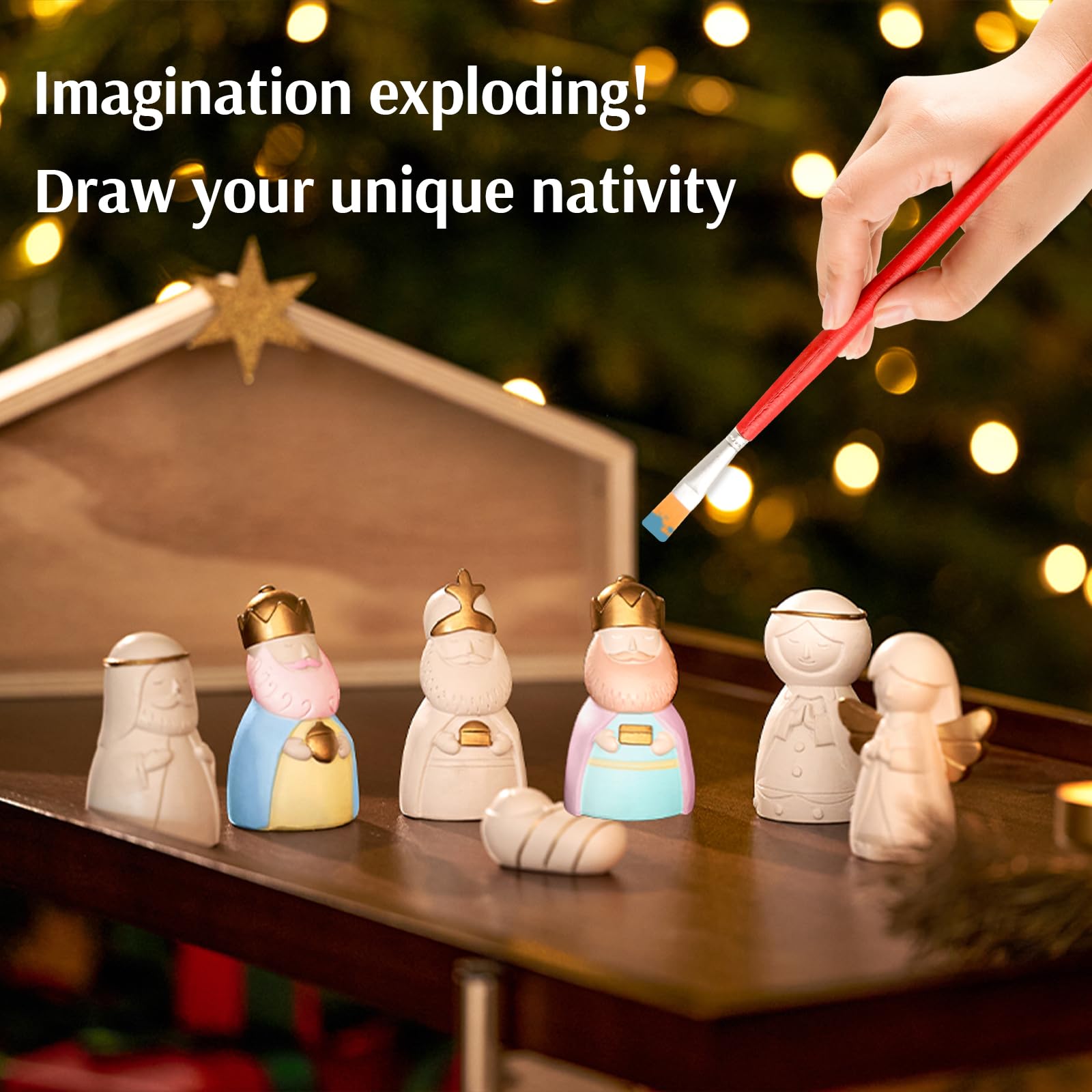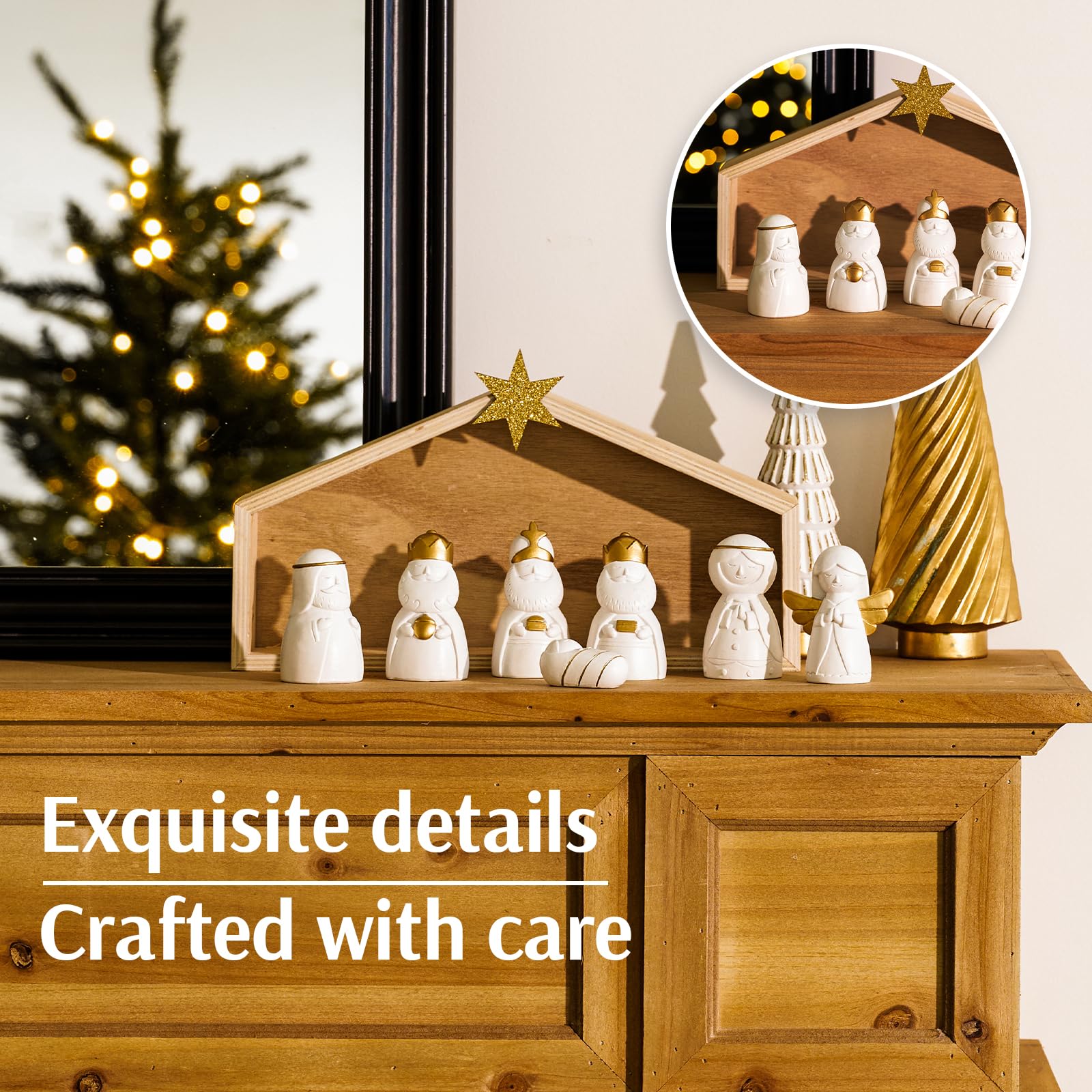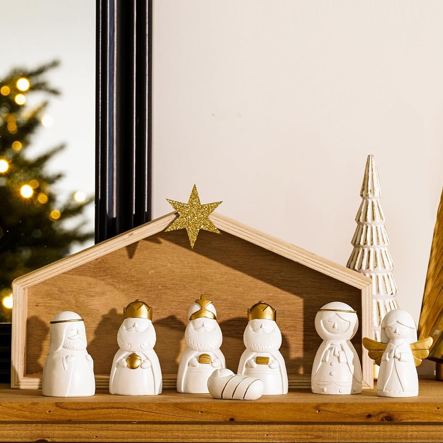 Modern Christmas Decoration: Enhance your home decor with this exquisite miniature nativity scene set for kids. Crafted in pure white and gold, it exudes a modern and holy sense that will captivate everyone's heart. With measurements of 11.73''x6.10''x2.01'', our tiny and simple nativity set with the perfect size to adorn any space and delight guests with its cute appearance. | Doodleable 8 Piece Nativity Set: The baby Jesus, Mary, Joseph, 3 Kings, an Angel are hand craft by resin, the wood manger with a gold star, this Christmas nativity set integrally shows the scene. This set of multiple statues is also a good gift sent to collectors, family, and kids. The white surface allows them to paint on it themselves, creating their unique painting nativity scene. | Multiple Application: Whether you want to add a touch of Christmas magic to your farmhouse, small apartment, or tabletop, this nativity set with a stable is the perfect choice. It's also an ideal gift for collectors and families, serving as a beautiful ornament for holy religious decorations and providing a tangible example for children to learn about the Christmas story of Jesus