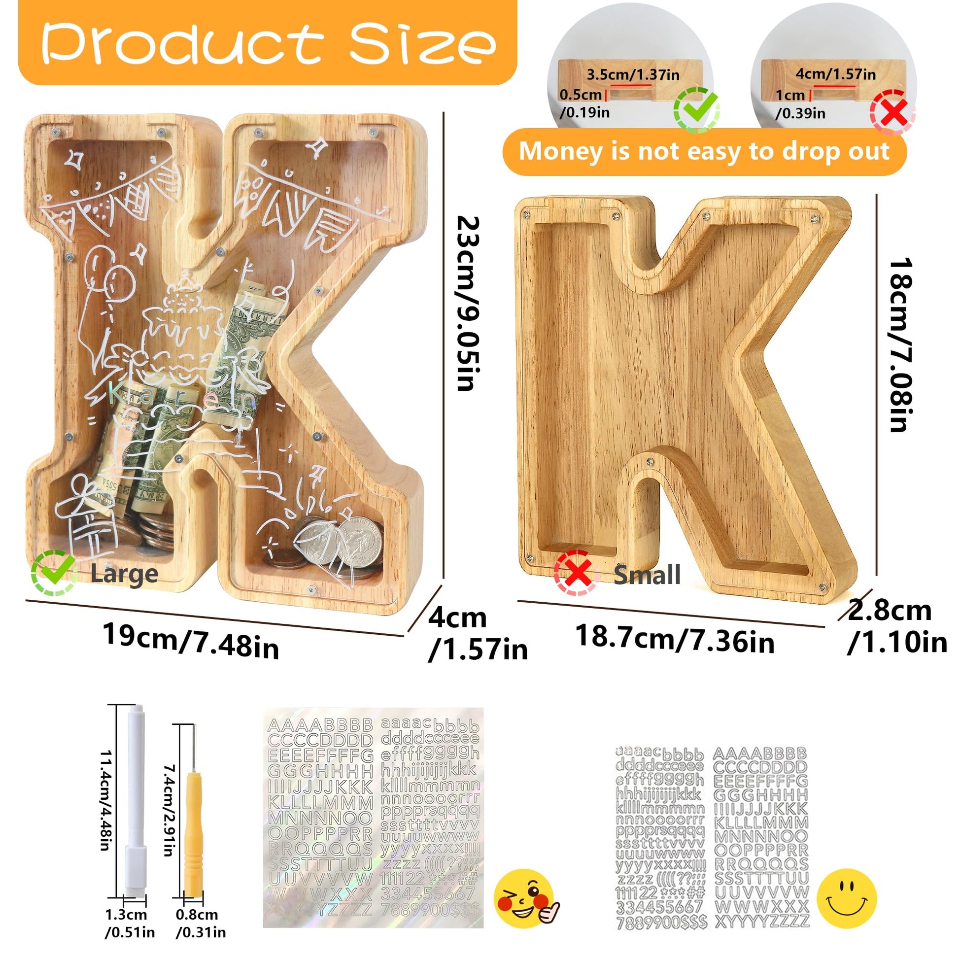 weallbuy Large Letter Piggy Bank for Kids Boys Girls Wooden Personalized Piggy Banks A-Z with Target Area Clear Alphabet Banknote Coin Banks for Gift Decoration Baptism (K)