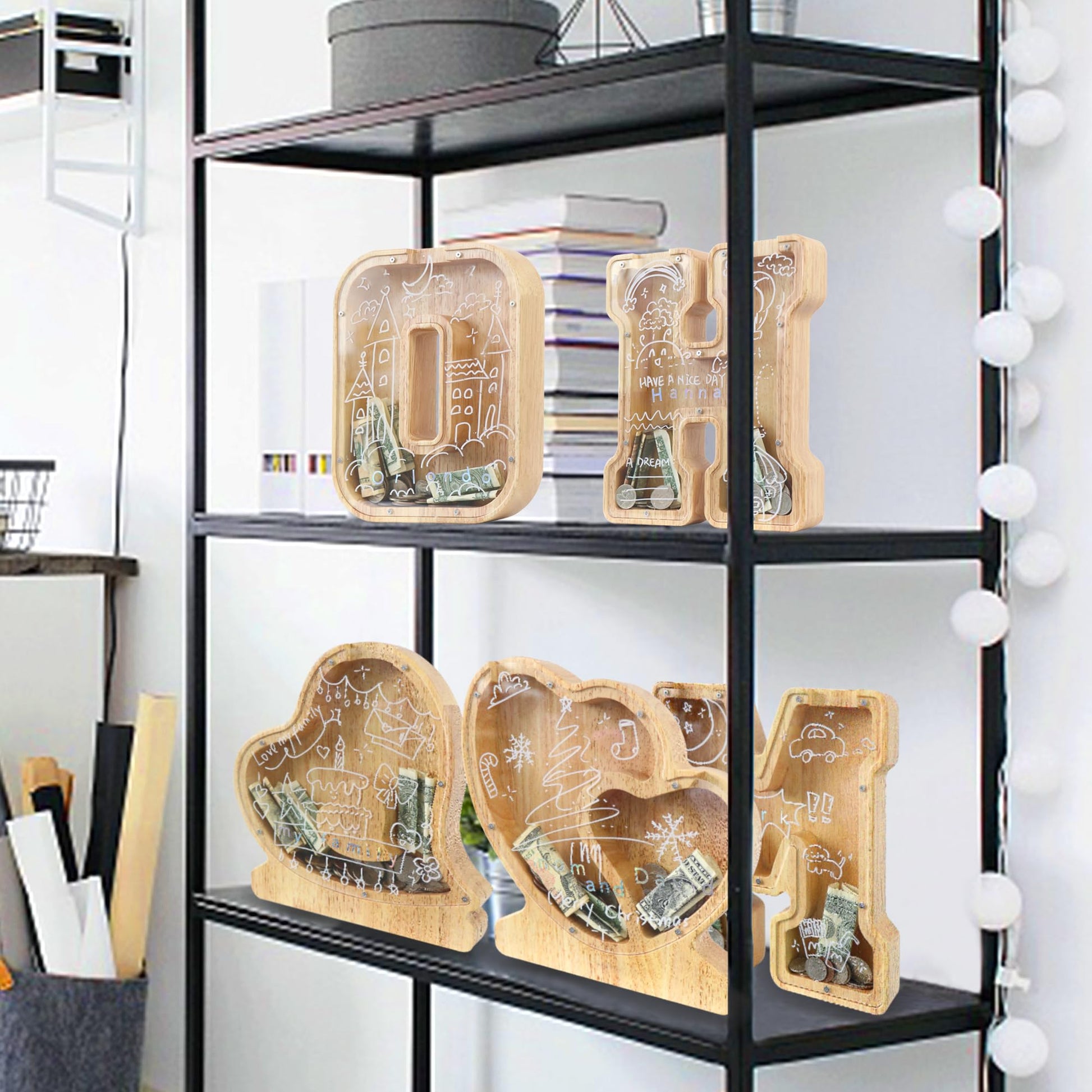 ??Fun and educational toys?Weallbuy brings a newly designed wooden letter piggy bank that makes children's savings growing and helps them achieve one savings goal after another. The transparent acrylic plate on the front allows children to clearly see the progress of saving attracting them to actively participate in saving and cultivating good saving habits and financial management skills.