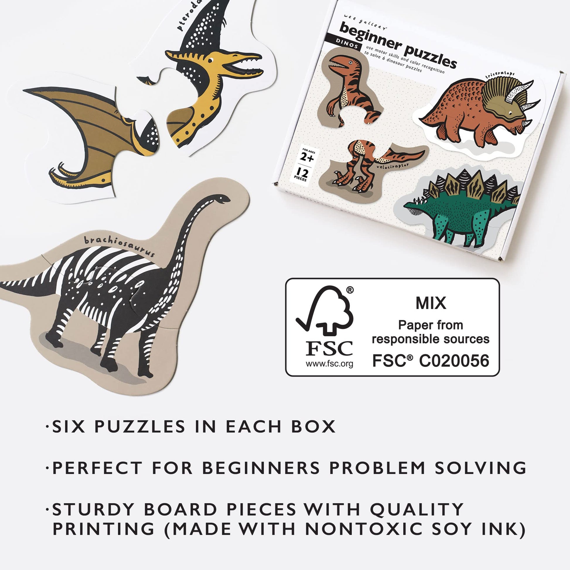 Wee Gallery Dinos Beginner Puzzle - Jigsaw Puzzles For Toddlers - Sensory Toys Promoting Cognitive & Motor Development - Sustainable Learning Toys For Toddler, Kids (12 Pieces, 6 Puzzles)