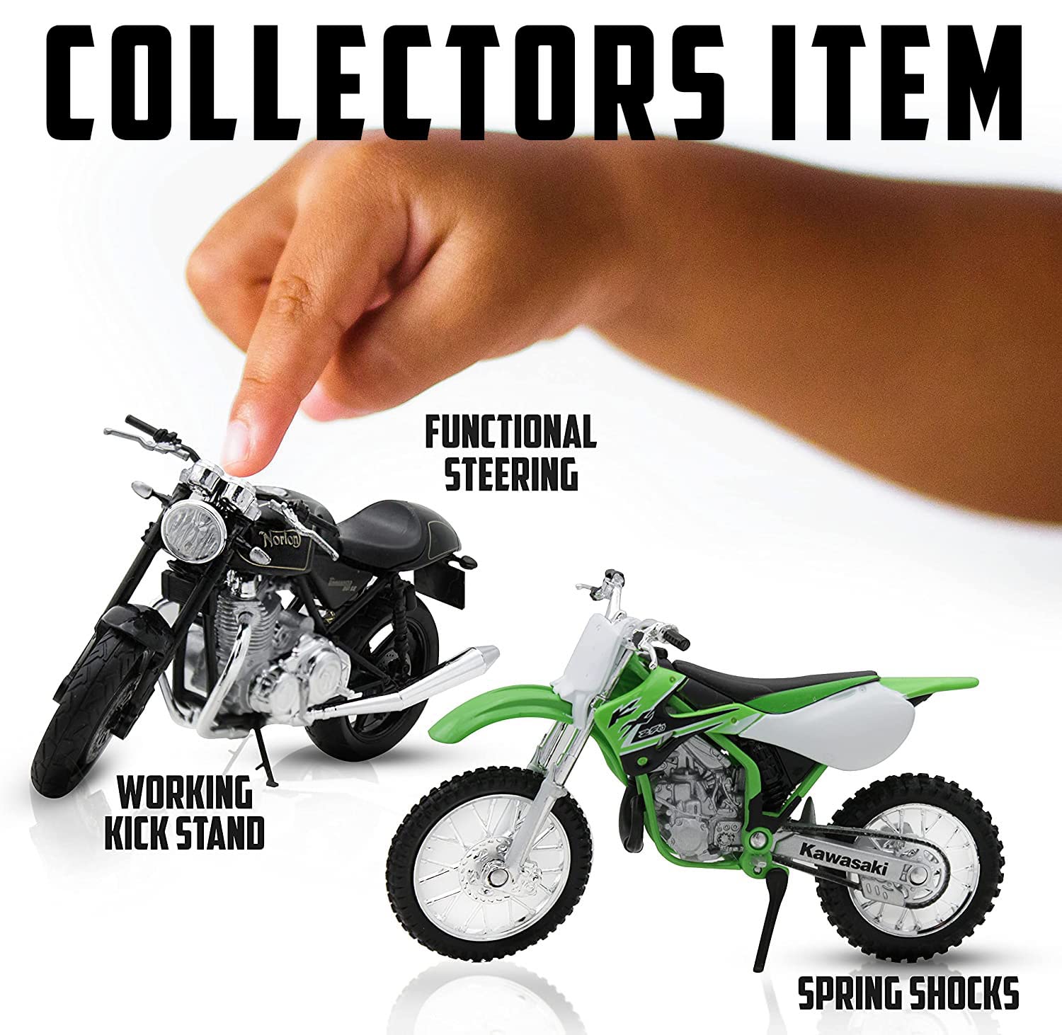 - Q: Can the motorcycle's parts move? A: Yes, the model features rotating rubber tires, a working kickstand, adjustable handlebars, and a front wheel for added realism.