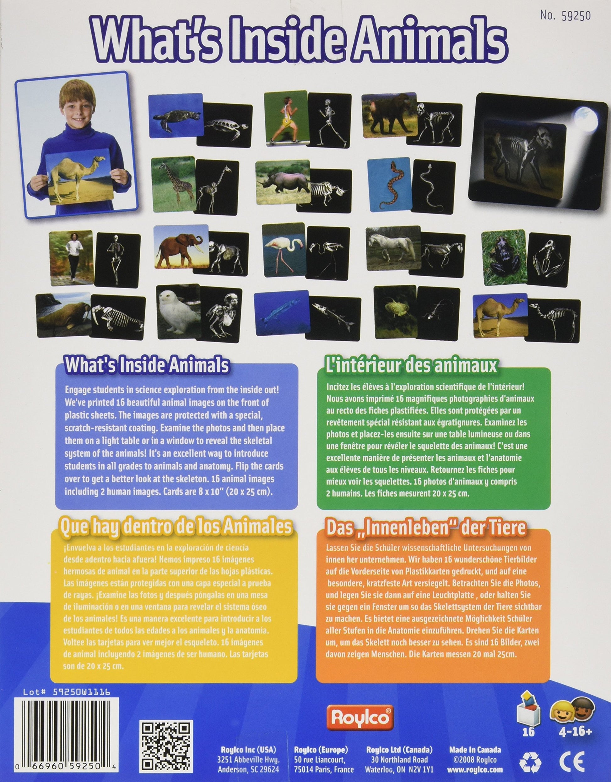 4 years & up. 16 double-sided photo/x-ray cards engage students in science exploration from the inside out! Images are protected with a special scratch-resistant coating. Examine the photos and then place them on a light table or in a window to reveal the skeletal system of the animals! An excellent way to introduce children to animals and anatomy. Flip the cards over to get a better look at the skeleton. Teacher guide included. Cards are 8.5' x 11'.