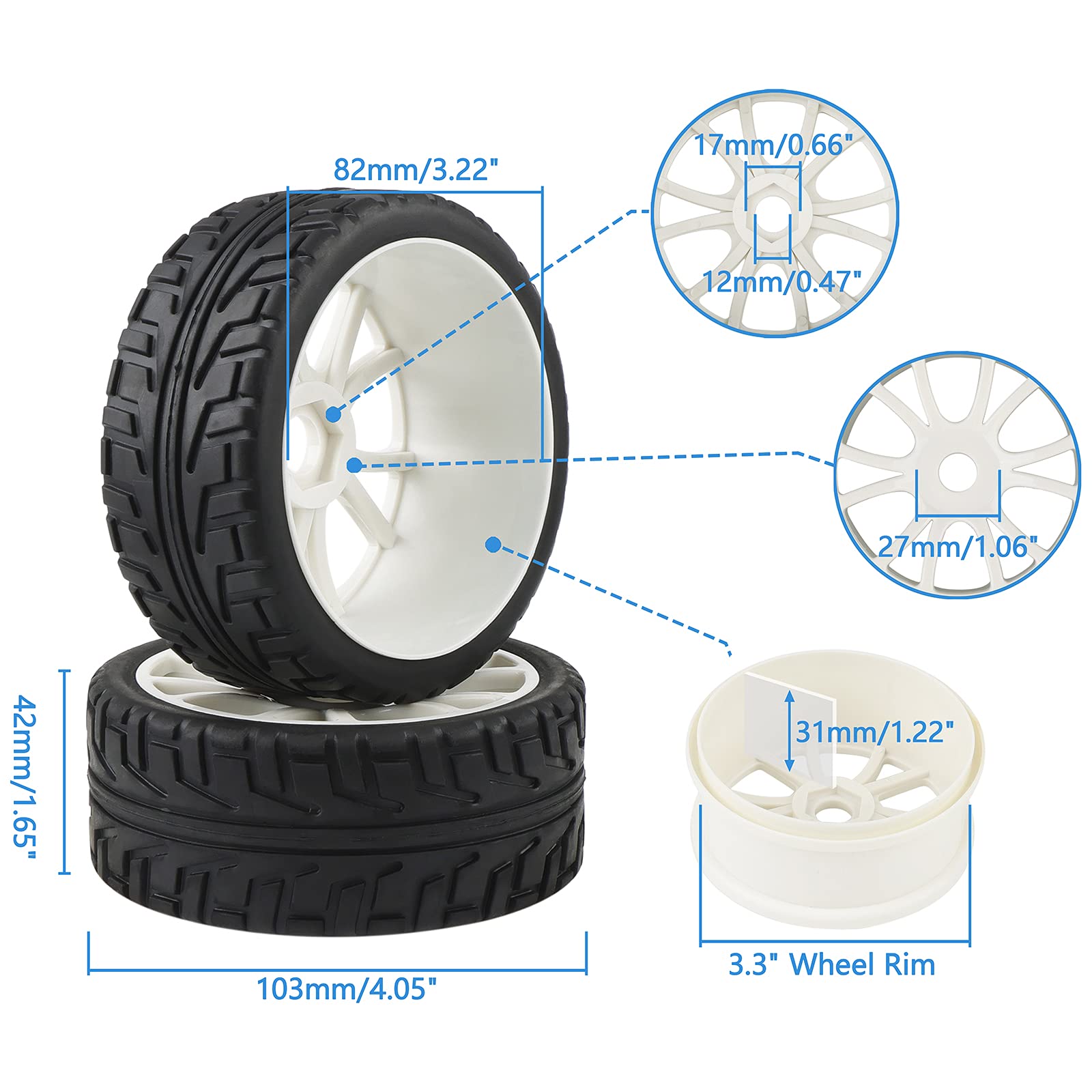 • Q: What is the size of the tires and wheels? A: The tire outer diameter is 4.05 inches (103mm), with a width of 1.65 inches (42mm). The wheel diameter is 3.22 inches (82mm), and it has a wheel drive hex size of 0.66 inches (17mm).