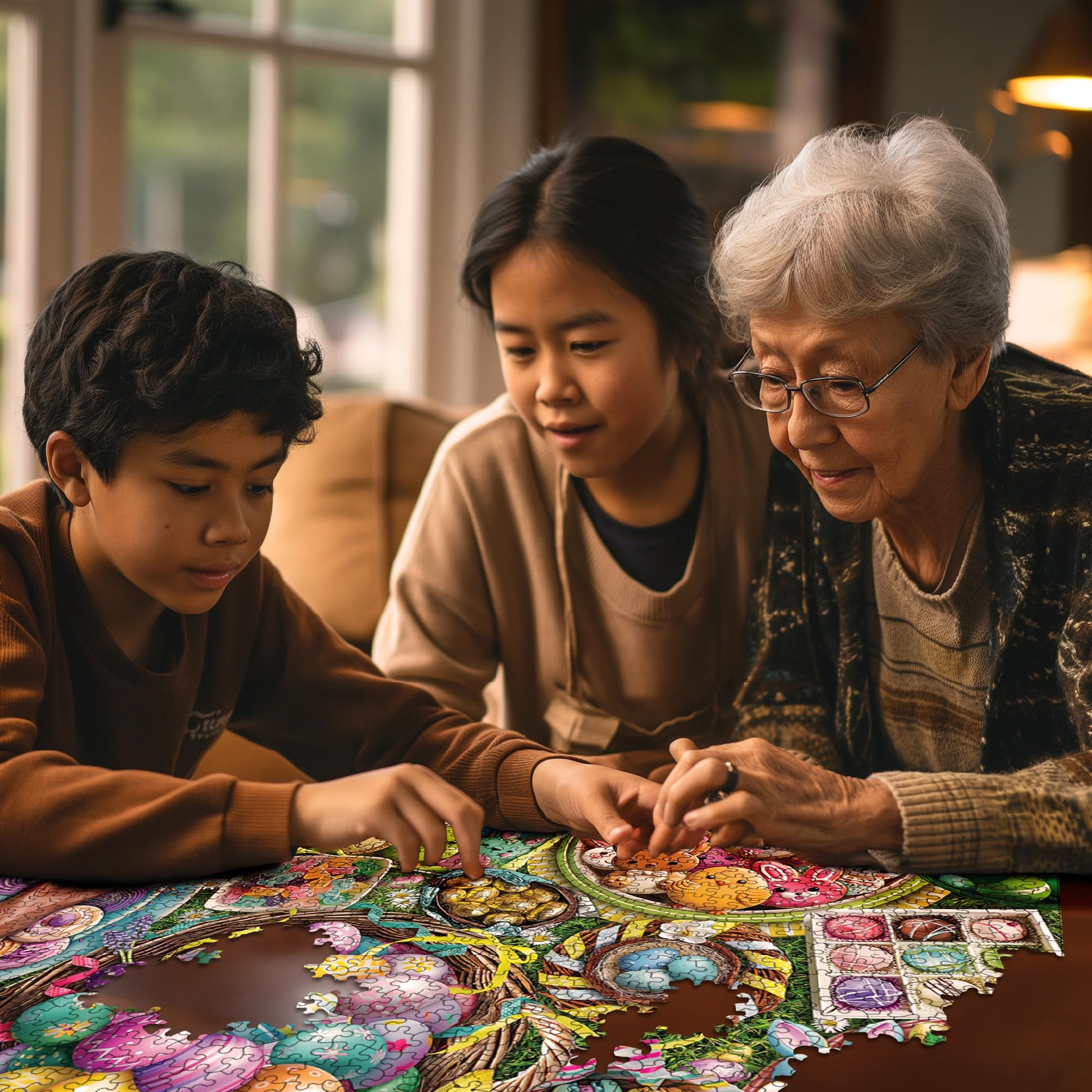 For more than 30 years, White Mountain Puzzles has been making high quality puzzles for families. Our colorful jigsaw puzzles, created by renown artists, come in different levels for all ages. The pieces are bigger and thicker than other puzzles, and are made with high-quality blue chipboard so they're easy to handle and put together. White Mountain offers both 1000 piece jigsaw puzzles, and 500 piece puzzles. Plus, every puzzle comes with a poster, making it easy to see the finished picture. Made right here in the USA.