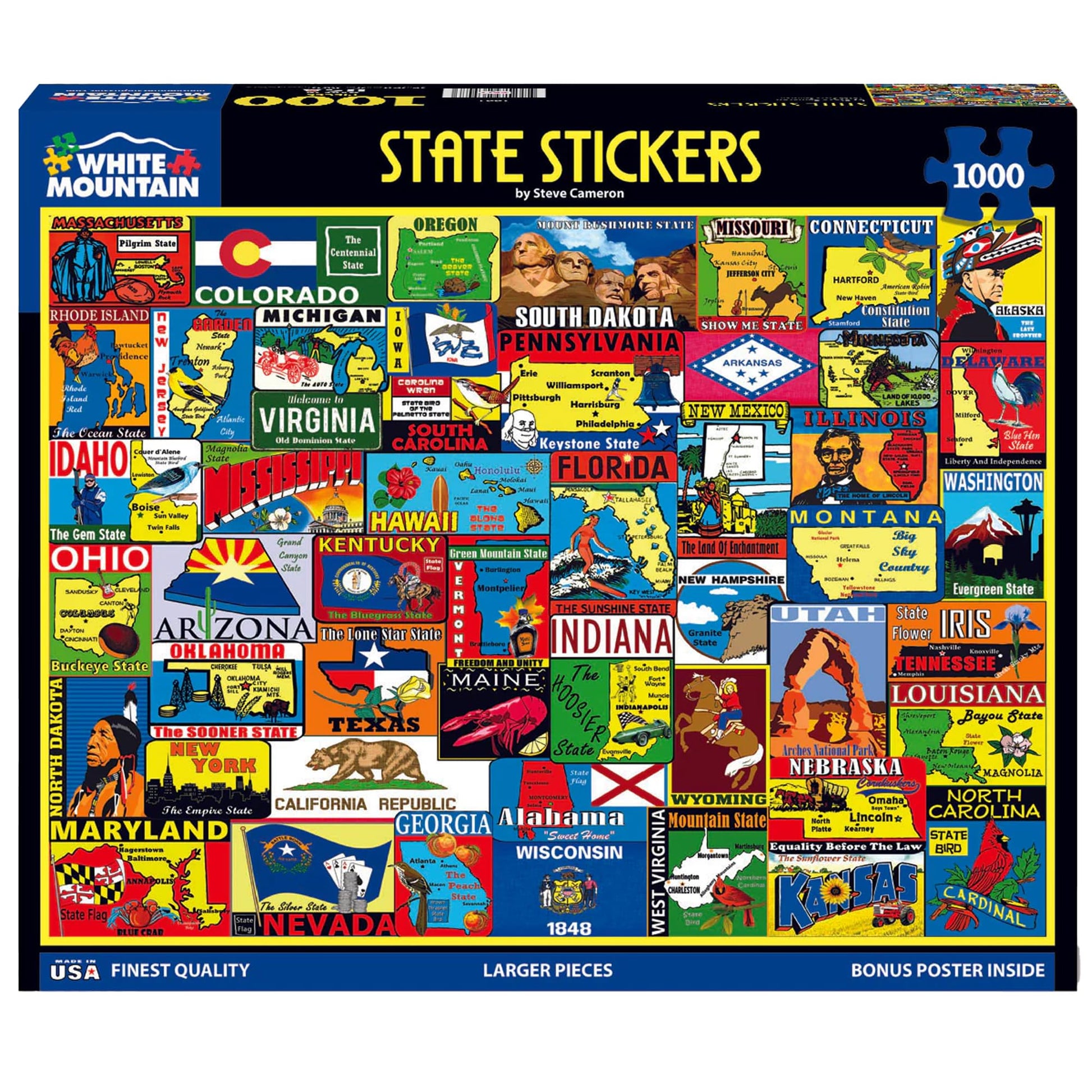 - Q: What makes the White Mountain Puzzles State Stickers unique? A: The White Mountain Puzzles State Stickers jigsaw puzzle features a colorful collage that showcases what each U.S. state is known for, including flags, slogans, and state birds, making it both a fun and educational experience.
