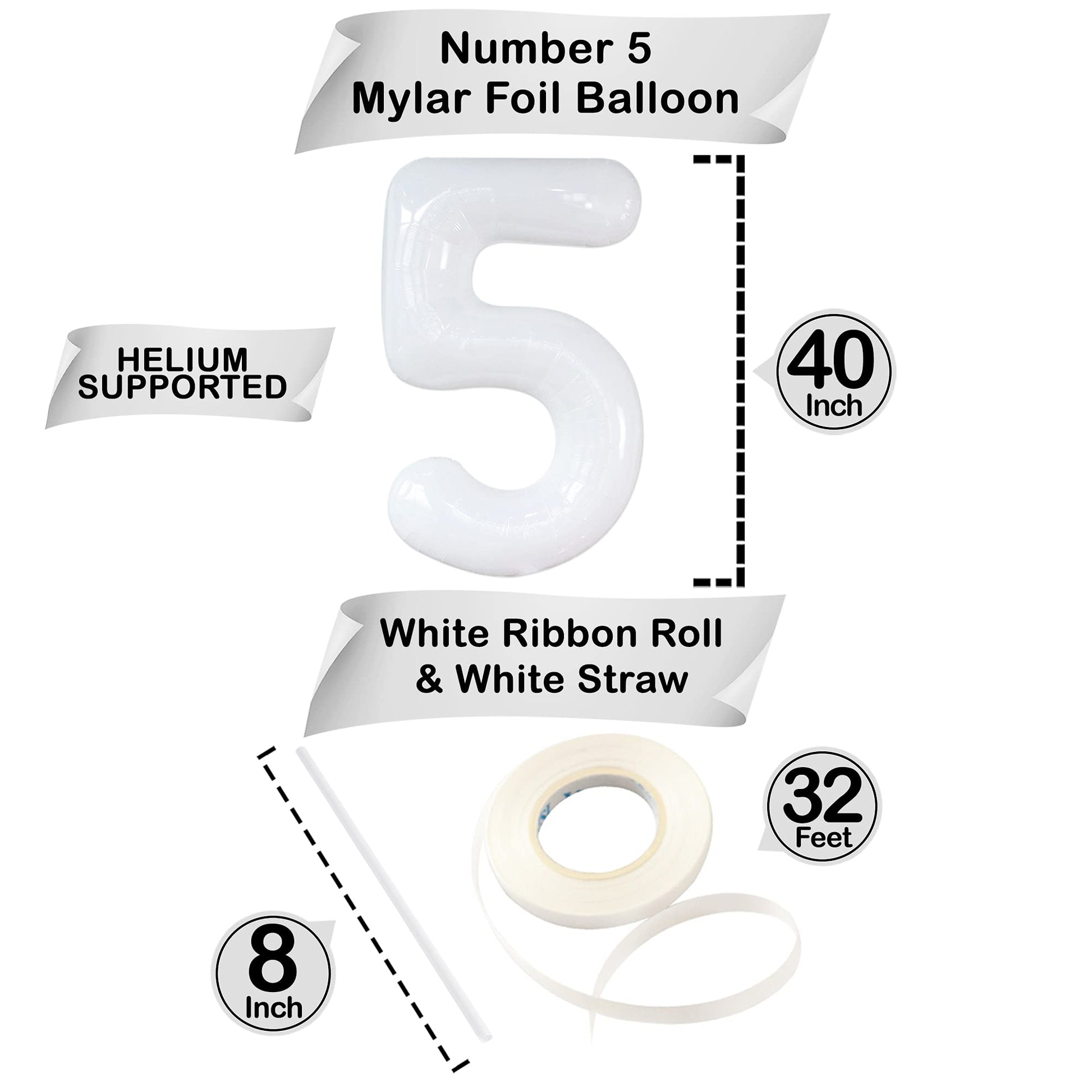 1)White Number 5 Balloon; 40 Inch Helium Supported2) 32 Foot (10 Meters Balloon String), White Color