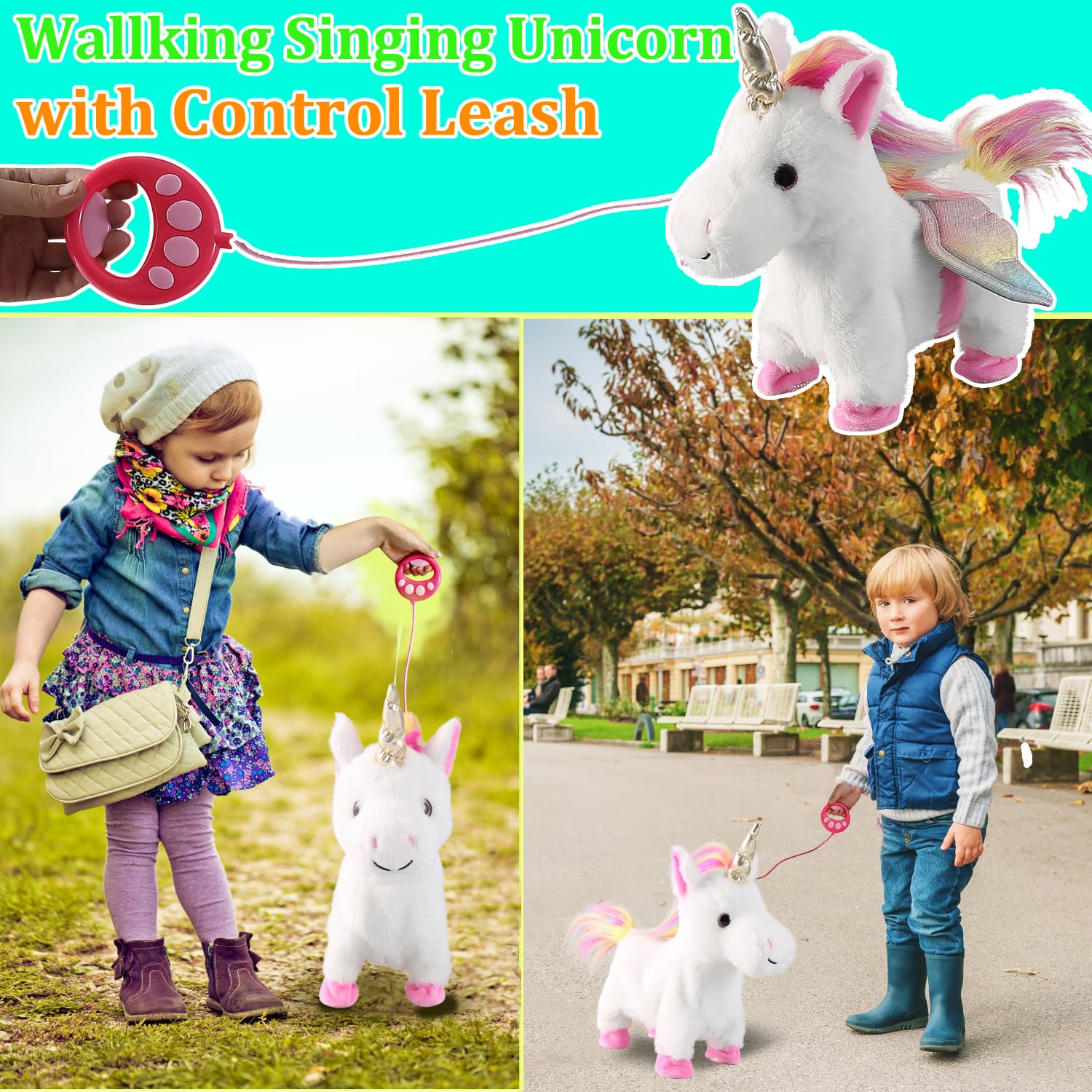 Walking Unicorn Toy Set Singing Dancing Electronic Plush Unicorn With Control Leash, Realistic Footsteps Nodding Tail Wagging Pretend Dress Up Cute Wings Animated Stuffed Unicorn Gift For Girl