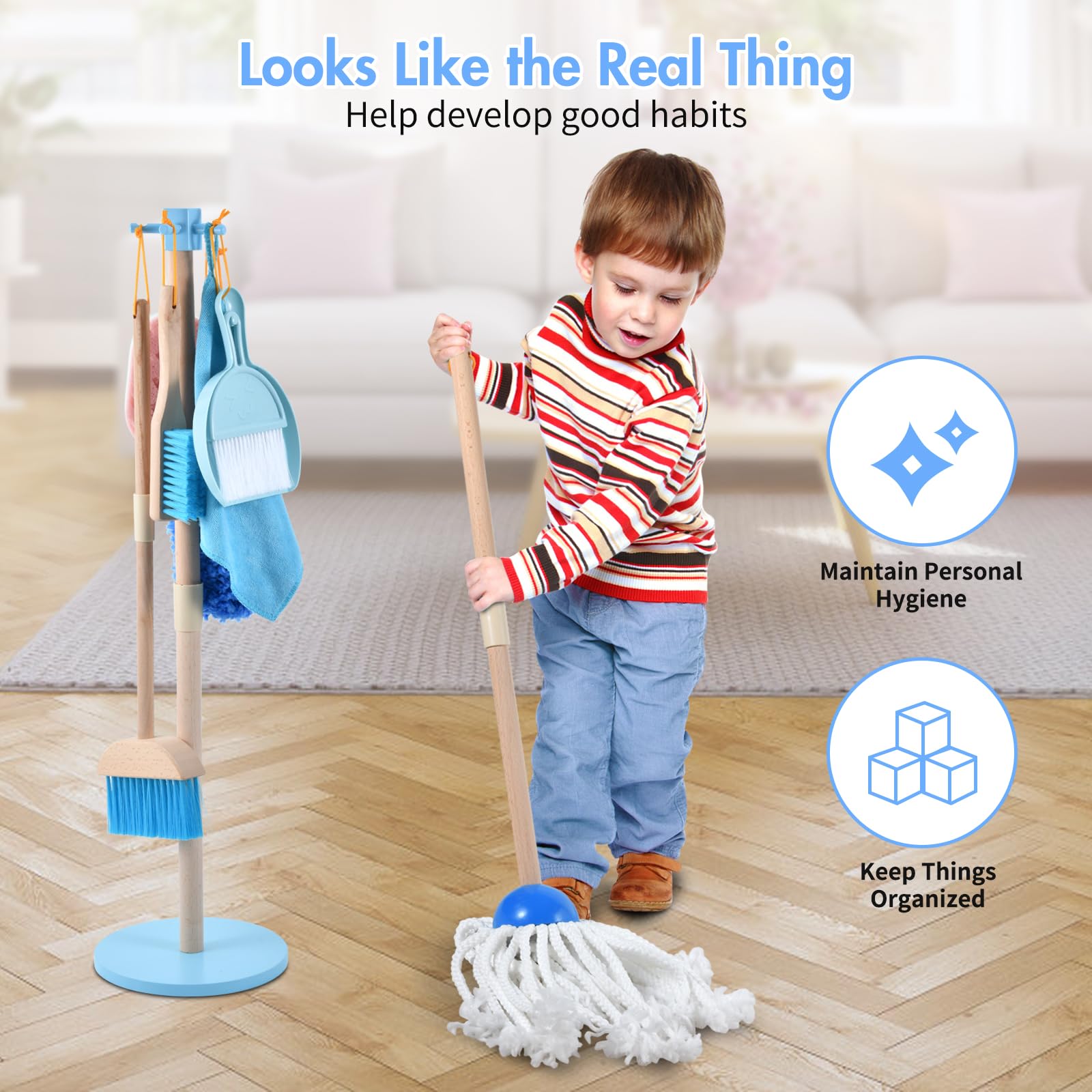 Whoholl Wooden Toddler Cleaning Set, Blue Toys Montessori Toys For 3+ Years Old Boy, Housekeeping Play Set Includes Broom Mop Du