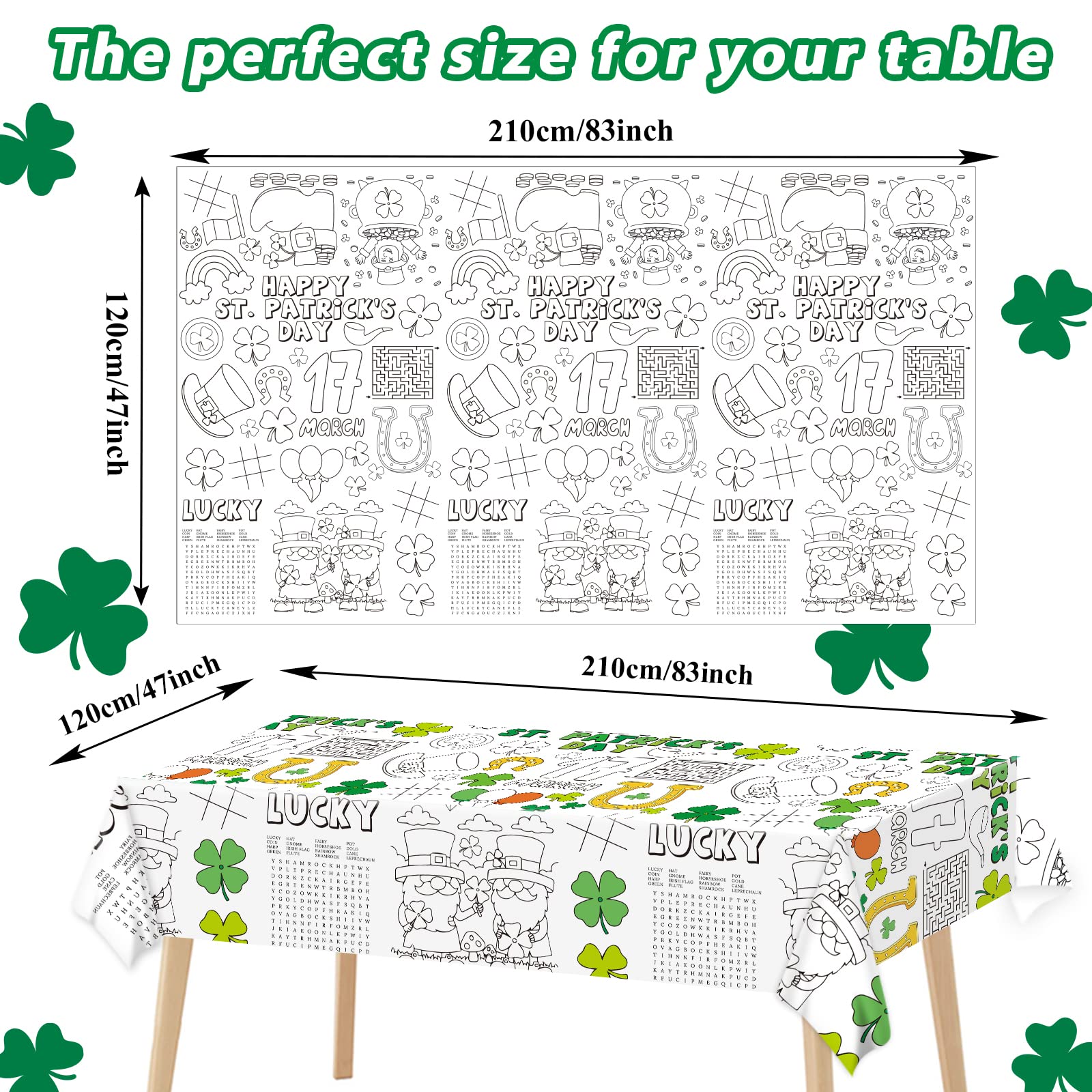 St. Patrick'S Day Giant Coloring Tablecloth Posters Activity 47''X 82'' For Kids, Xmas Huge Holiday Color-In Poster Paper Table Cover Arts And Crafts Great For Girls Boys Kids Preschool Kindergarten Classroom Wall Art Creative Design: The St. Patrick'S Day Color-In Diy Tablecloth Has An Educational Function. Except For The Iconic Patterns Of St. Patrick'S Day Creatures Like Shamrock, Leprechaun, Gnomes, Rainbow..., The Giant Coloring Poster Is Also Designed With Puzzles Like Maze Games And Word Games And Can Arouse Your Kids' Interest And Are Beneficial To The Students And Kids' Creativity And Development. Specifications: Material: Size: 47X82 Inch Color: As The Picture Shown Package Includes: 1 X Giant St. Patrick'S Day Coloring Tablecloth