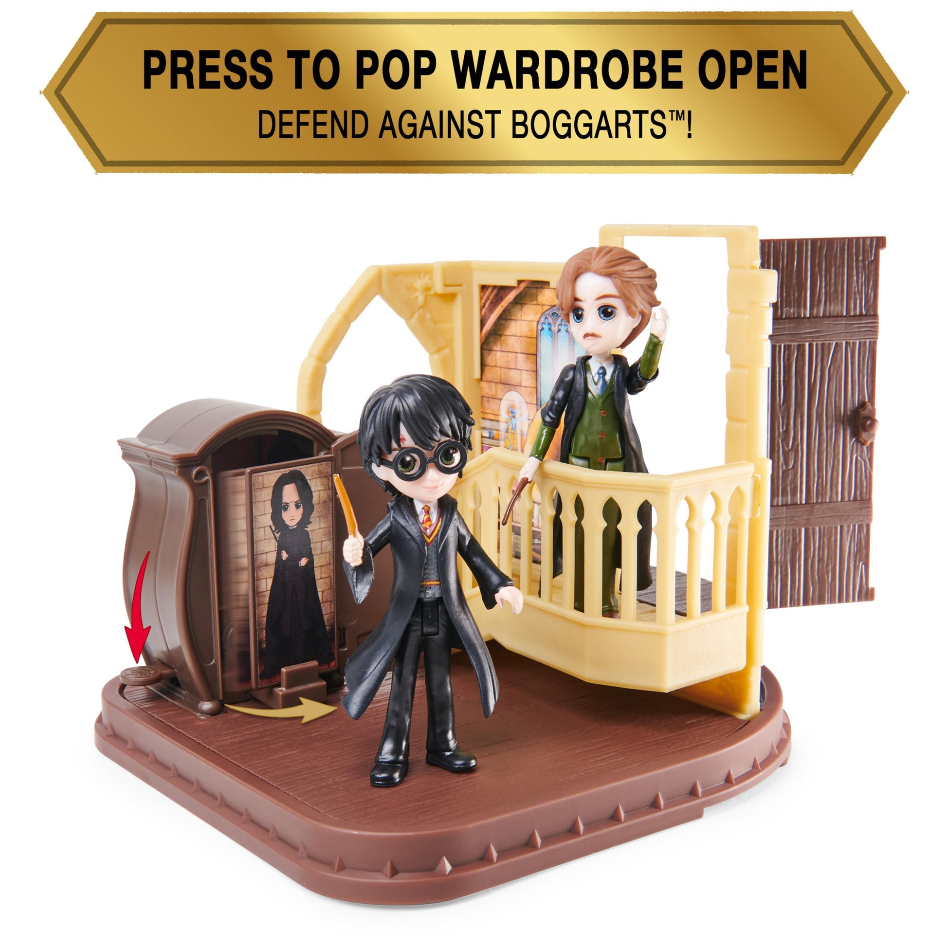 Experience the magic of Harry Potter with the Wizarding World Magical Minis Defense Against the Dark Arts Classroom! Featuring limited availability 3-inch Harry Potter and Professor Lupin dolls and five accessories young witches wizards and Muggles can recreate their favorite Harry Potter scenes from the iconic Hogwarts classroom. Pose each doll and pretend to cast spells as you play out your spellbinding adventures with this fun playset. Harry can learn spells from Professor Lupin at the bench and desk then head to the wardrobe to defend against the Dark Arts. Place a double-sided Boggart panel (two included) in the cabinet and close the door then press the side of the wardrobe to make it pop open revealing a Boggart like in the movies! Press again and the panel flips around to the character on the other side! The Defense Against the Dark Arts playset will inspire your imagination through fun and exciting pretend play. The back of the playset even looks like Professor Lupins office; open the door and step inside! When youre finished playing store the extra panel behind the wardrobe. For even more ways to play you can connect the playset into the Magical Minis Hogwarts Castle (sold separately)! Scan the QR code on the box to view the collector poster and expand your collection with all of the Magical Minis Harry Potter dolls and doll playsets (small dolls and sets each sold separately). Wizarding World Harry Potter toys are must-have gifts for kids who enjoy collectibles wands action figures dolls and doll accessories. Theyre great birthday gifts Christmas gifts or stocking stuffers. Play out your favorite movie moments with the Wizarding World Magical Minis Defense Against the Dark Arts Classroom!