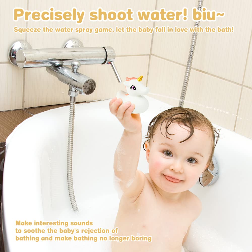 - Q: How do the unicorn bath toys work? A: The unicorn mother toy can squeeze to make funny sounds, while the unicorn babies can spray water, providing interactive play that captures your baby's attention and makes bath time fun.