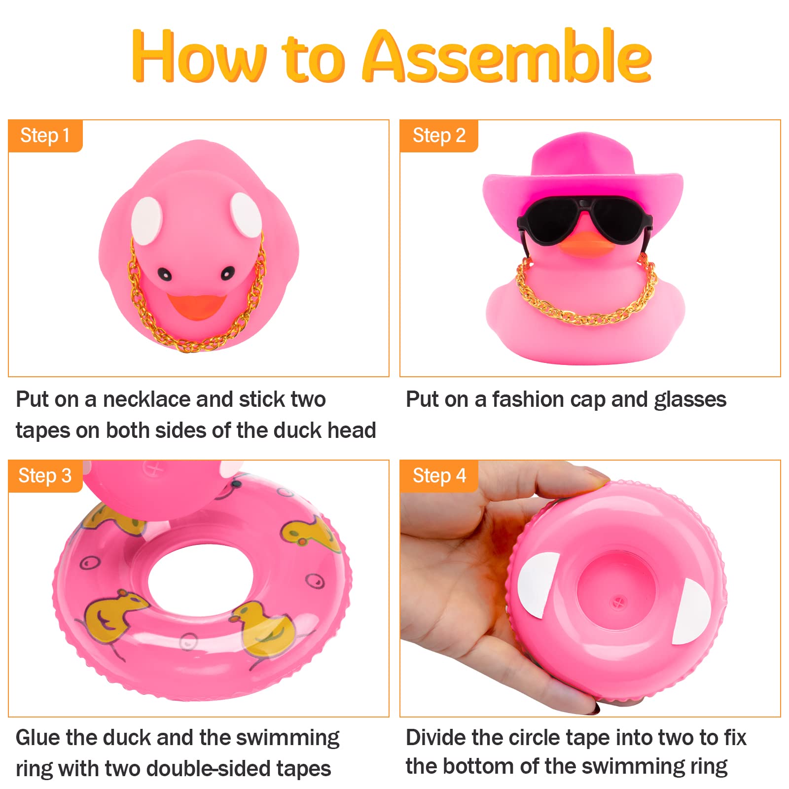 - Q: How do I assemble the wonuu car dashboard ducks? A: To assemble the wonuu car dashboard ducks, you need to put on the necklace, wear the glasses, place the hat on the duck's head using mini tapes, attach the duck to the swim ring with double-sided tapes, and finally secure the whole assembly to your dashboard with round tape.