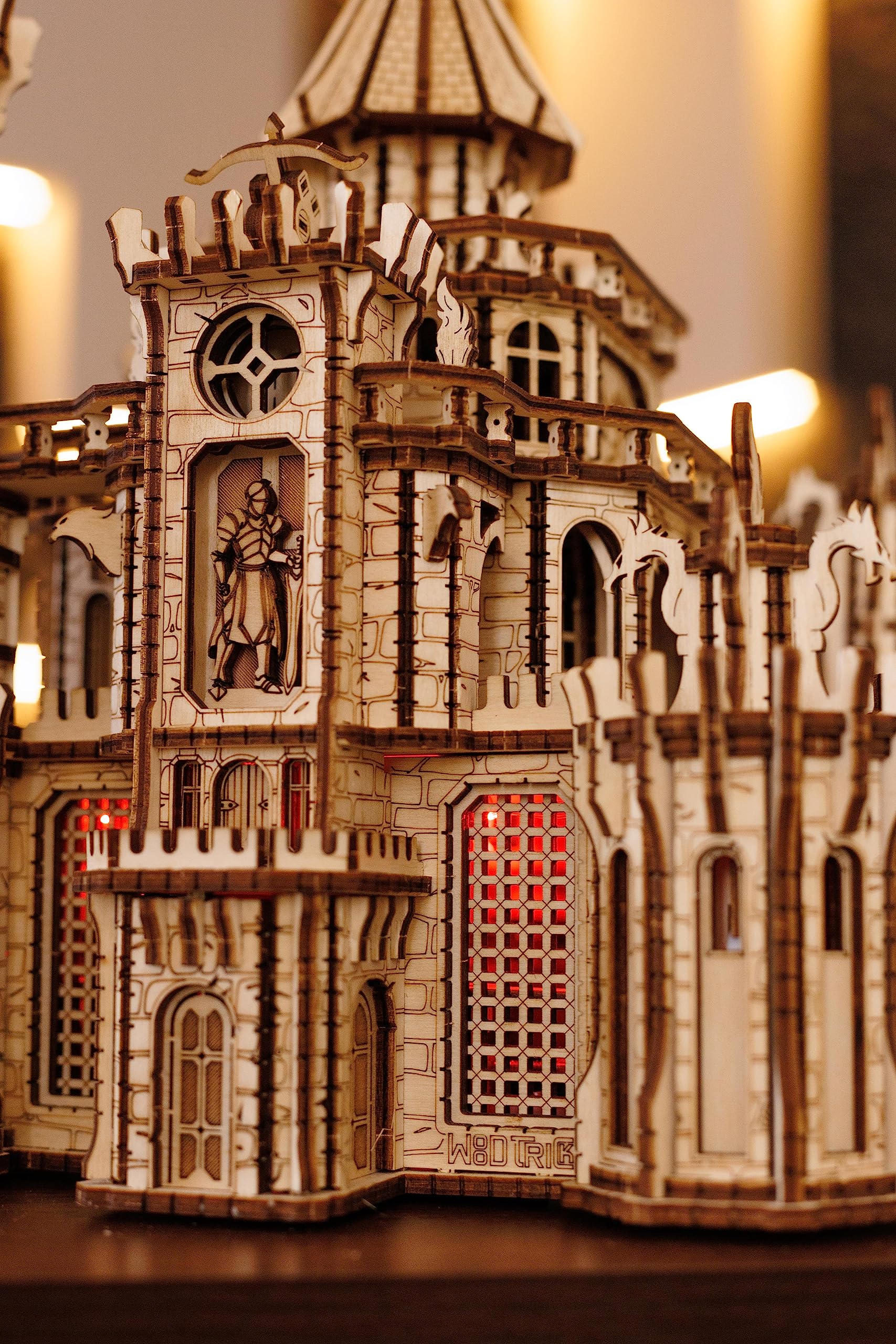 - Q: How does the red LED lighting enhance the puzzle experience? A: The red LED backlit effects of the Wood Trick Dragon Castle add a mesmerizing touch to the completed model. This feature not only enhances the visual appeal of your masterpiece but also creates an enchanting atmosphere that reflects the medieval theme of the puzzle.