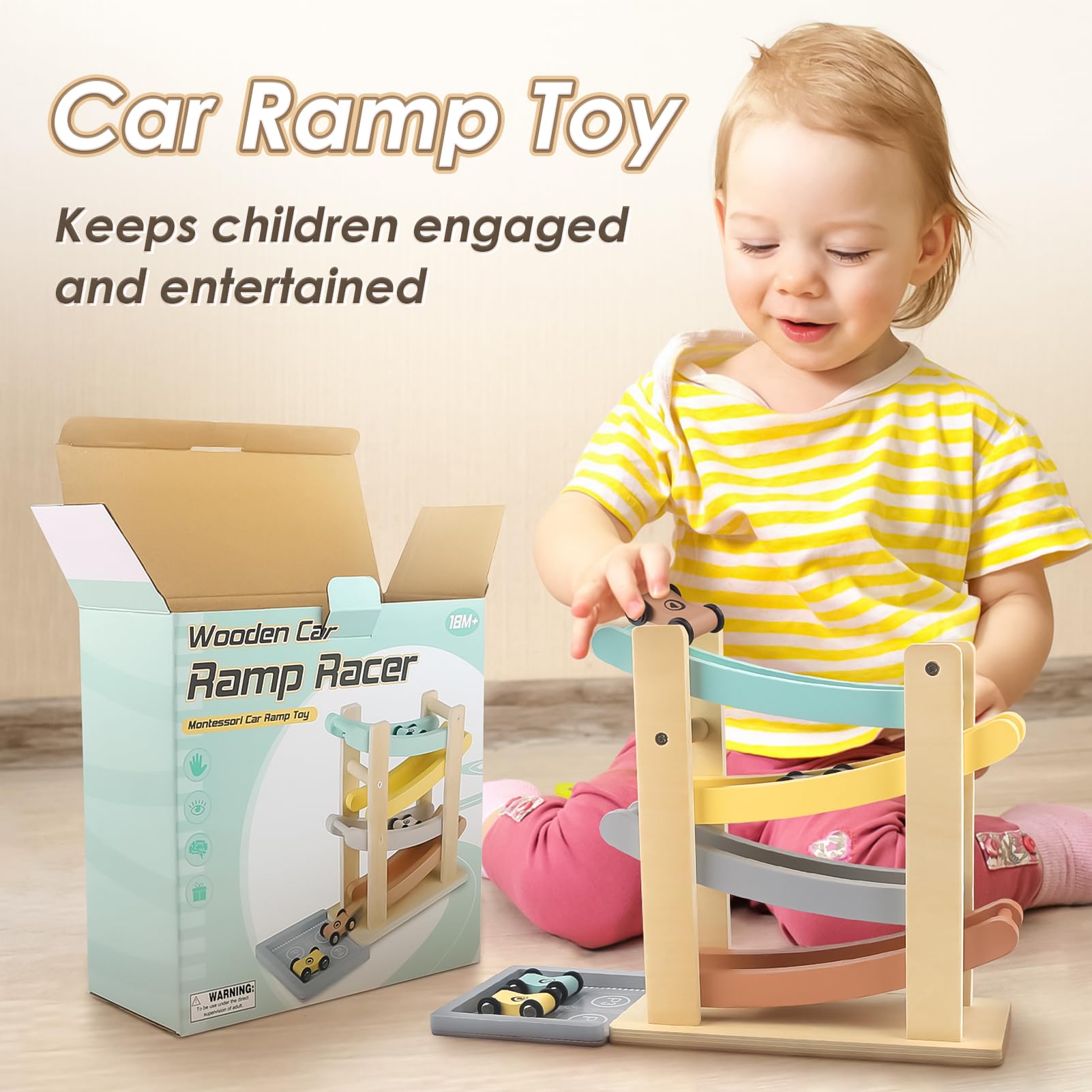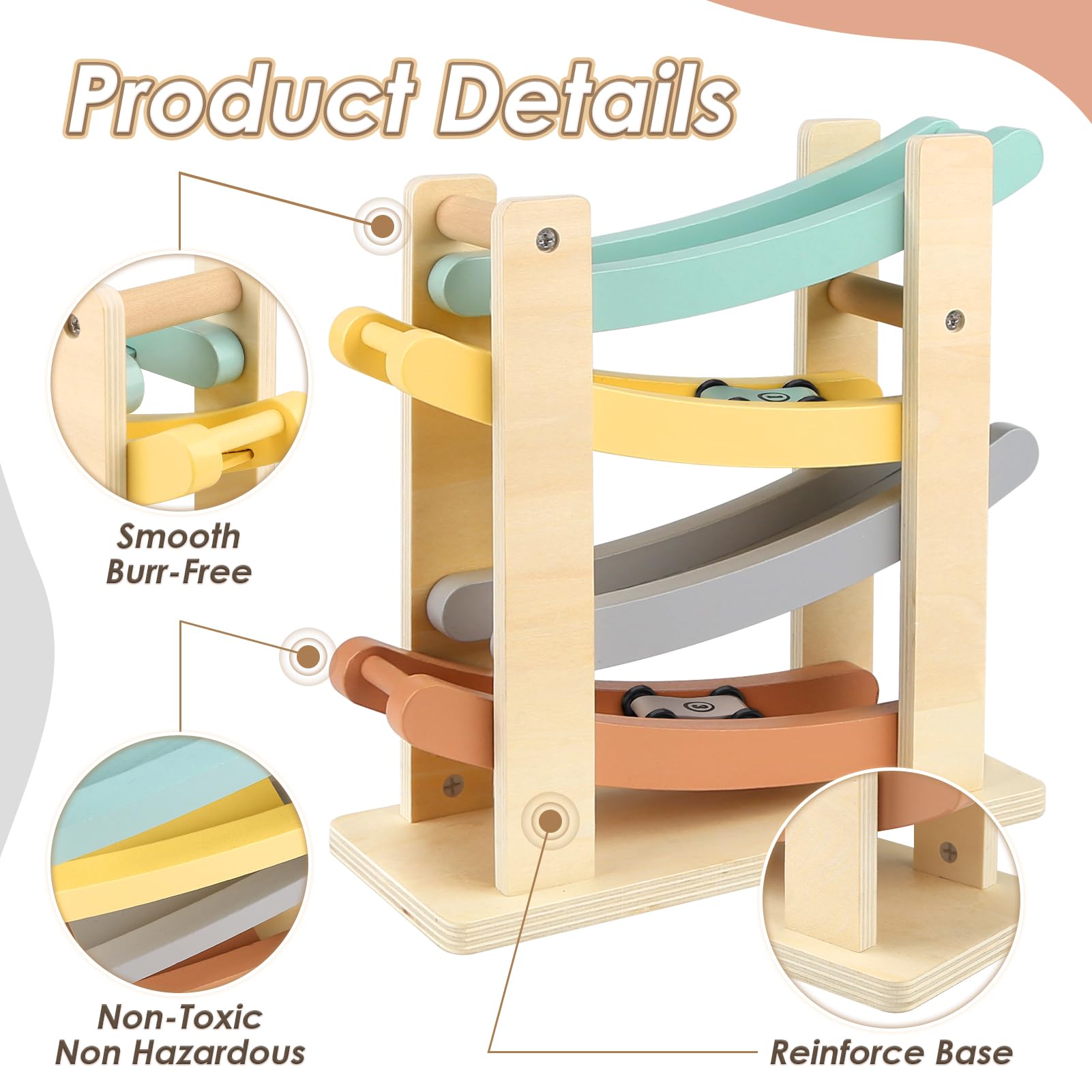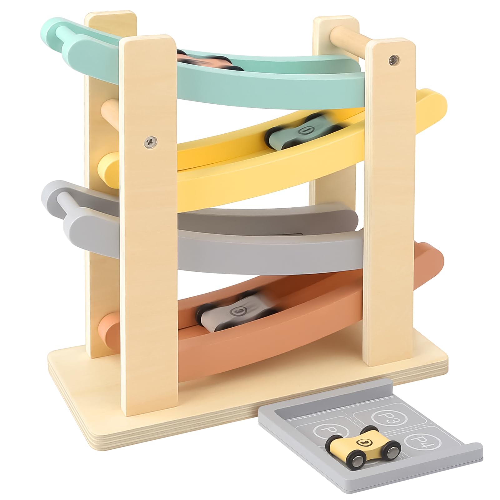 - Interactive Fun: Features four wooden cars that slide down the ramp, providing engaging racing fun and encouraging cooperation and turn-taking among toddlers.