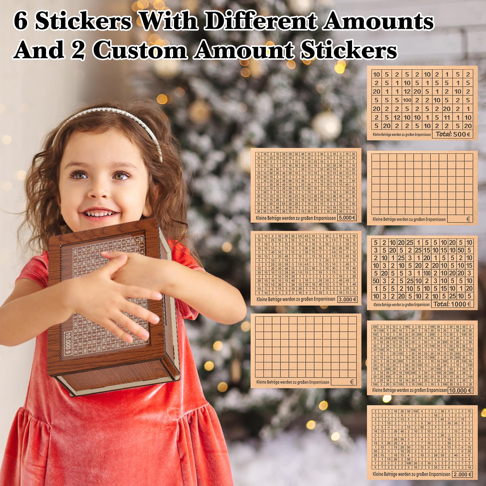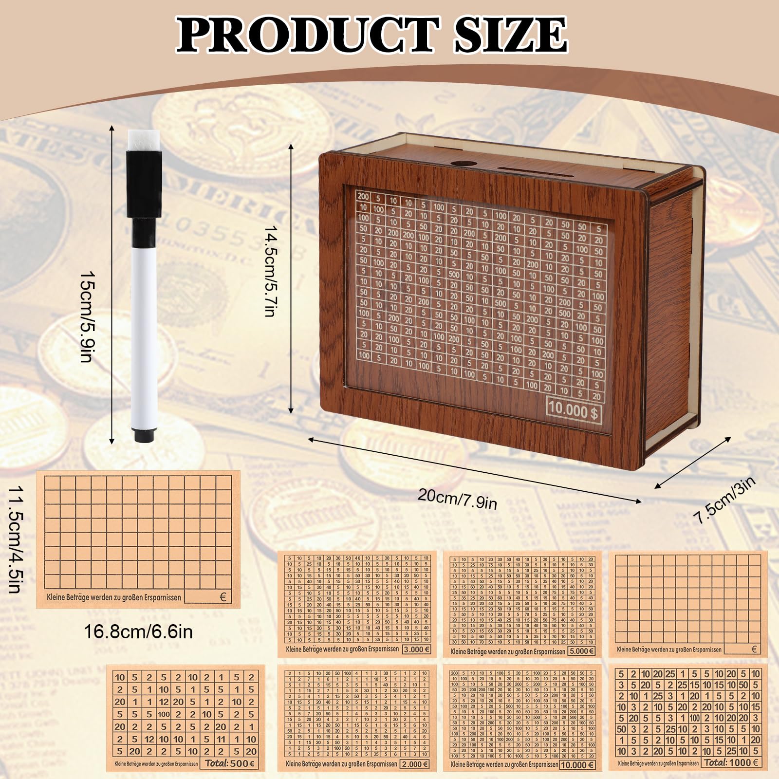 - Q: How does the savings goal feature work? A: The Wooden Money Box comes with 6 stickers representing different savings milestones (e.g., 500 USD to 10000 USD) and 2 blank papers for creating custom targets. Users can track their savings progress by depositing money and crossing off the corresponding amounts on the wooden panels.