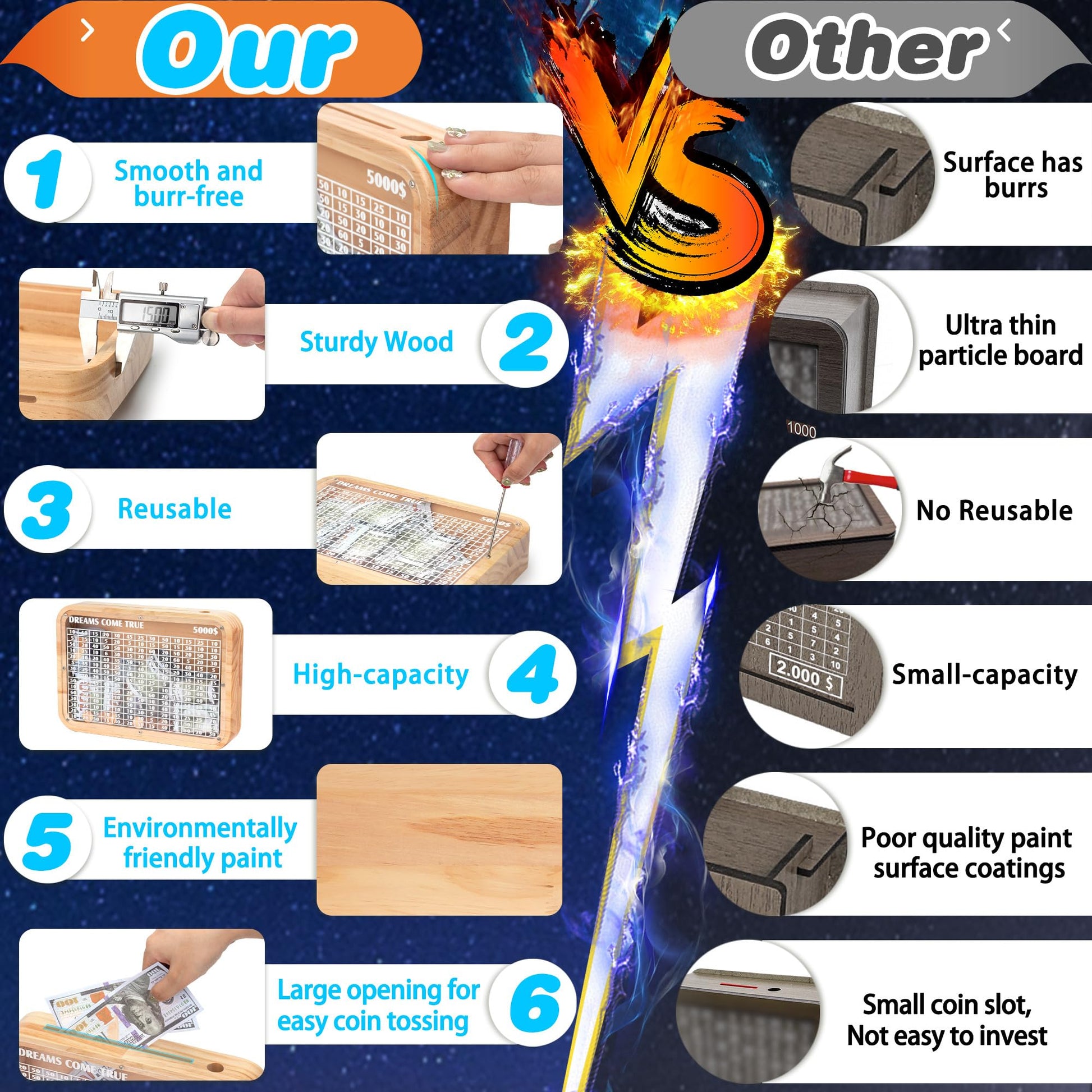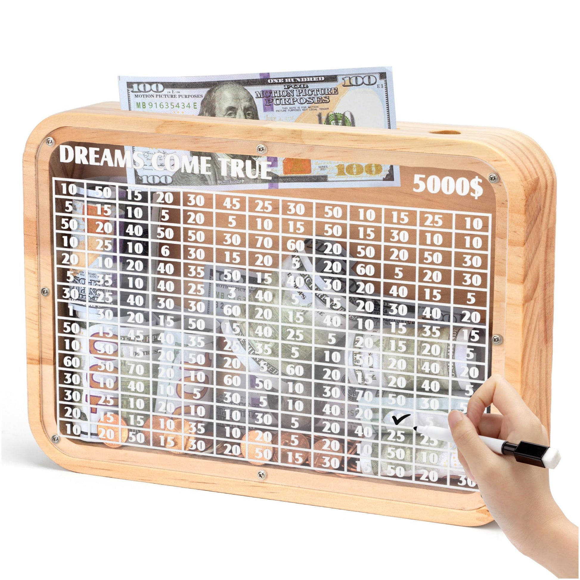 ?? Unique Design: This Target Money Storage Jar Combines Wood And Transparent Acrylic Panels, Not Only Presenting A Unique Appearance, But Also Showcasing A Warm Wooden Texture And Modernity. No Assembly Required, Can Be Used Directly, With A Smooth And Burr Free Feel, Safe And Environmentally Friendly, Lightweight And Comfortable. | ?? Family Significance: This Piggy Bank Is Not Only A Tool For Personal Savings, But Also A Symbol Of Shared Family Goals. Family Members Jointly Determine The Purpose Of Savings, Work Together To Save, And Make Every Investment Meaningful And Full Of Unity. | ?? Incentive Savings: By Setting Clear Goals And Storing Change And Banknotes In Them, Gradually Accumulating, It Motivates You To Continue Saving. The Saved Money Can Help You Achieve A Series Of Meaningful Things, Such As Traveling, Purchasing Desired Items, Or Other Dreams. At The Same Time, Its Minimalist Design And High-Quality Materials Make It A Fashionable Decoration For Homes Or Offices | ?? Convenient And Practical: This $5000 Savings Box Has An Easy-To-Use Coin Slot, Making It Easy To Deposit Paper And Coins. In Addition, It Is Equipped With A Clear Display Screen With Recordable Markings, Making It Easy To Mark And Clear, While Displaying The Amount Of Savings, Allowing You To Keep Track Of The Progress Of Savings At Any Time. | ?? Intentional Gift: As A Gift, This Piggy Bank Is Both Practical And Meaningful. Giving Gifts To Family And Friends Not Only Provides Them With A Place To Store Their Belongings, But Also Conveys Your Blessings For Their Dream Realization In Every Savings. In Addition, It Is Suitable For Giving To Family And Friends On Birthdays, Holidays, Or Other Special Occasions.