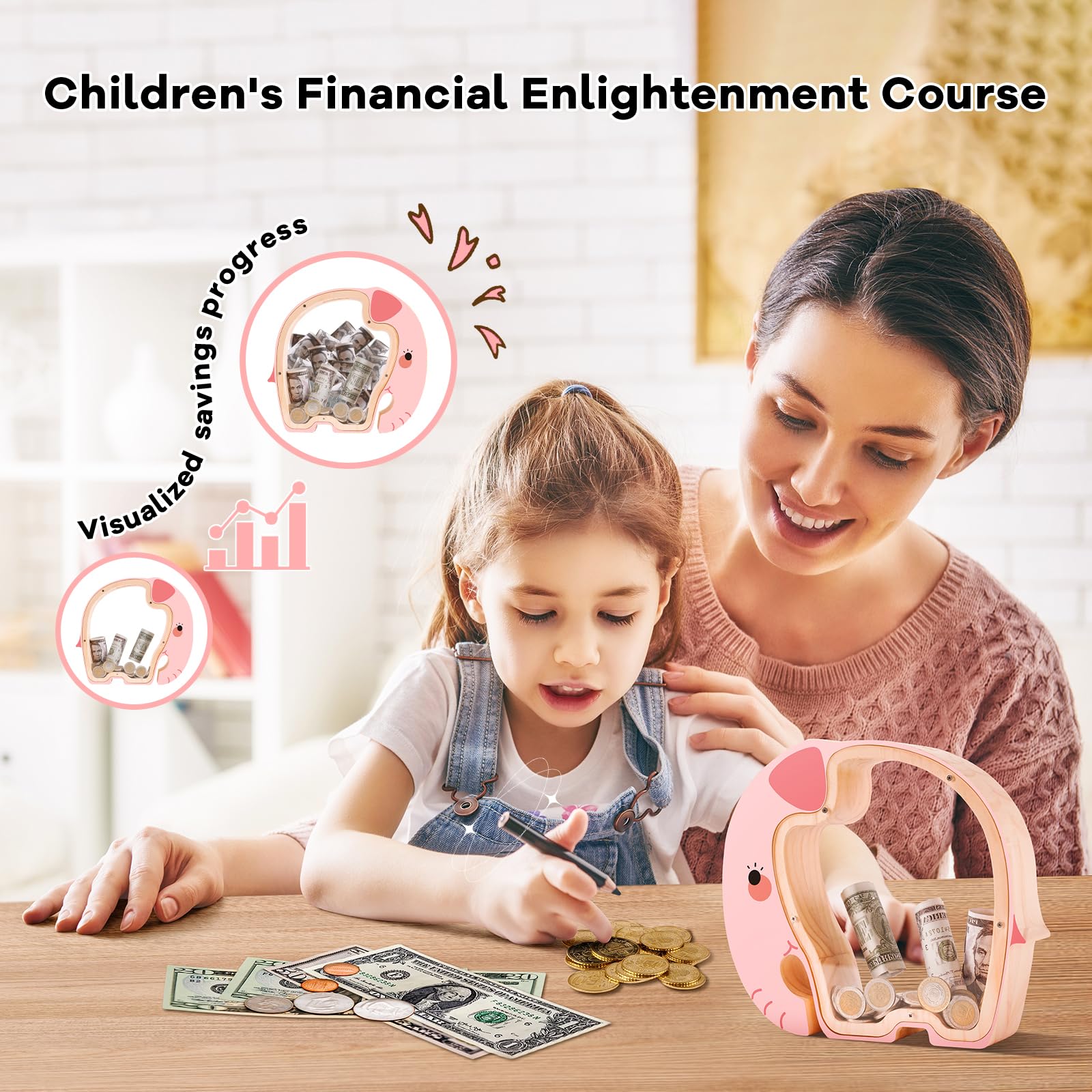 View compareWooden Pink Elephant Piggy Banks for Kids, Unbreakable Rabbit Coin Bank for Kids with Letter Sticker, Wooden Cashbox Money Jar P