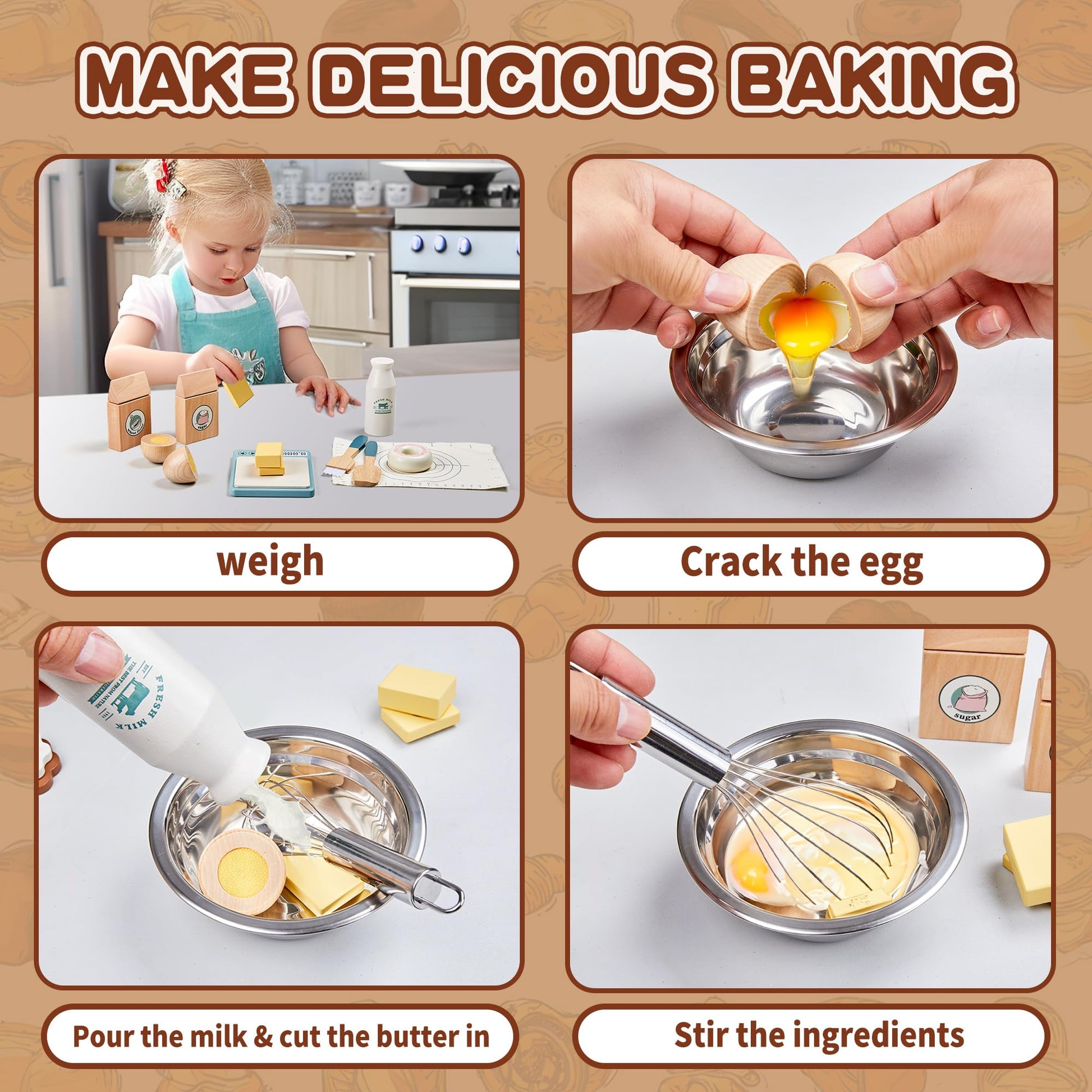 - Realistic Baking Toys: This wooden play food set includes 23 essential accessories such as a whisk, baking pan, scale, sugar, stainless steel basin, milk, cookies, and a shopping bag. Children will delight in putting on their aprons and pretending to cook, enhancing their imaginative play.
