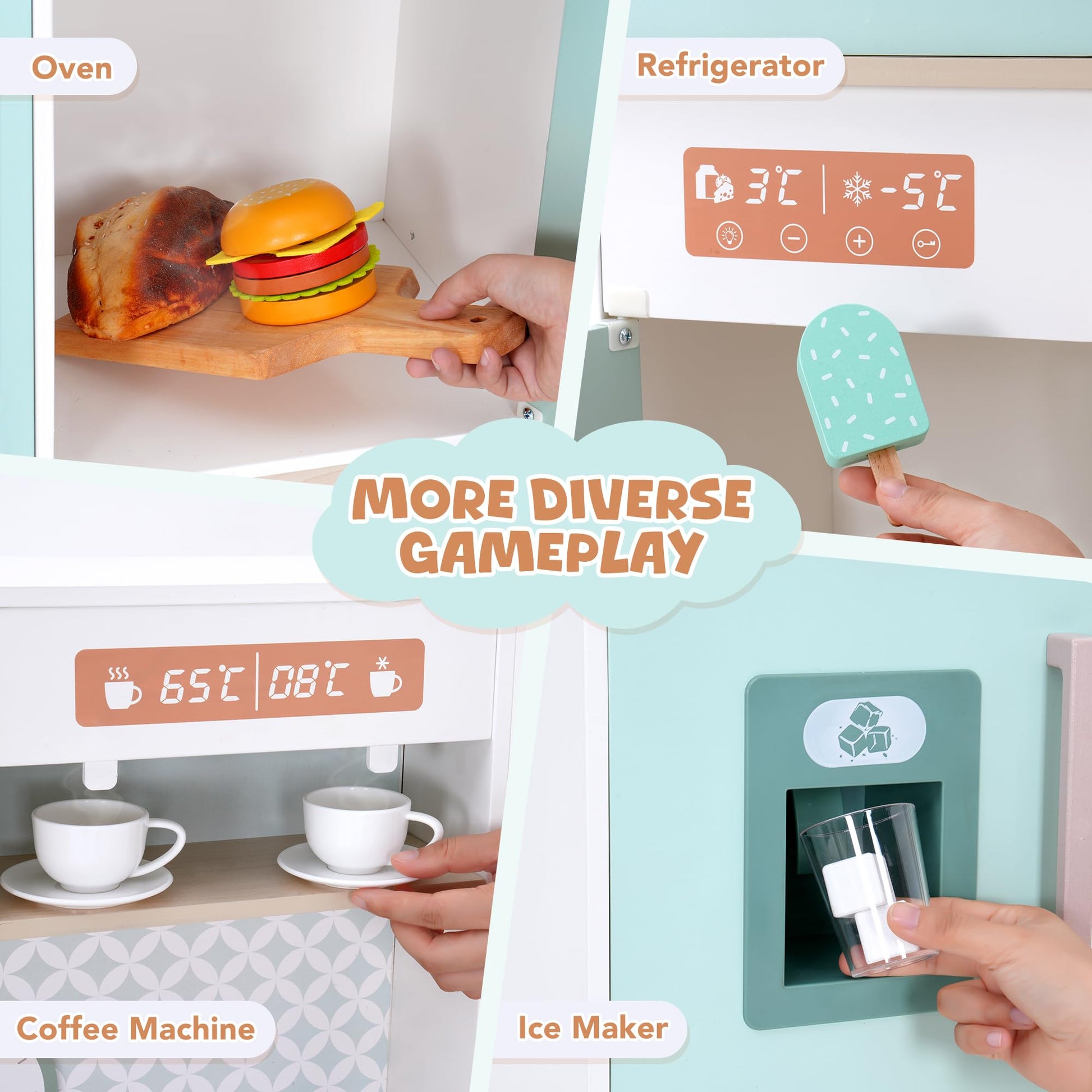 Fully Equipped Kitchen - Kids kitchen playset including sink with rotating tap, oven, tove, range hood, coffee maker, ice maker, refrigerator and microwave, also equipped with a variety of realistic cooking utensils such as soup pots, pans, shovel and spoons, stoves and microwave ovens have sounds and lights that simulate real cooking, and there are separate buttons to control on and off,wooden large play kitchen can meet the children's play needs and make pretend games more lively | Amusement Park for Kids - It is very suitable for several children to get together, and everyone can come to pretend to be a restaurant. They can order food, make food, and act as waiters and customers. Children can enjoy their childhood and learn some useful knowledge in the process of playing.Educational kitchen toys allow kids to learn about cooking and food while having fun, making this toy kitchen a great addition to any playroom | High Quality And Sturdy - Made of eco-friendly, omplying with US ASTM F963 and CPSIA standards. Designed with kids in mind.Large storage space and a stable structure ensure that this kitchen playset is safe and durable for even the most active preschool child | Geat gift - Come with many accessories, including cutting food, simulated fruits, toy kitchen sets, a chef hat, and apron. Not only provides fun playtime for young children, but is also important for education. The perfect play kitchen for 3-8 year olds is ideal for creative role play toy and the perfect gift for kids birthday and Christmas | Warm Suggestion - If you smell a little odor when you open the box, this is due to the product being in a sealed box for a long time during the shipping process. Please put the product in a ventilated place after unpacking it. Kitchen toys come with assembly instructions. Please contact us in case of missing parts or installation problems