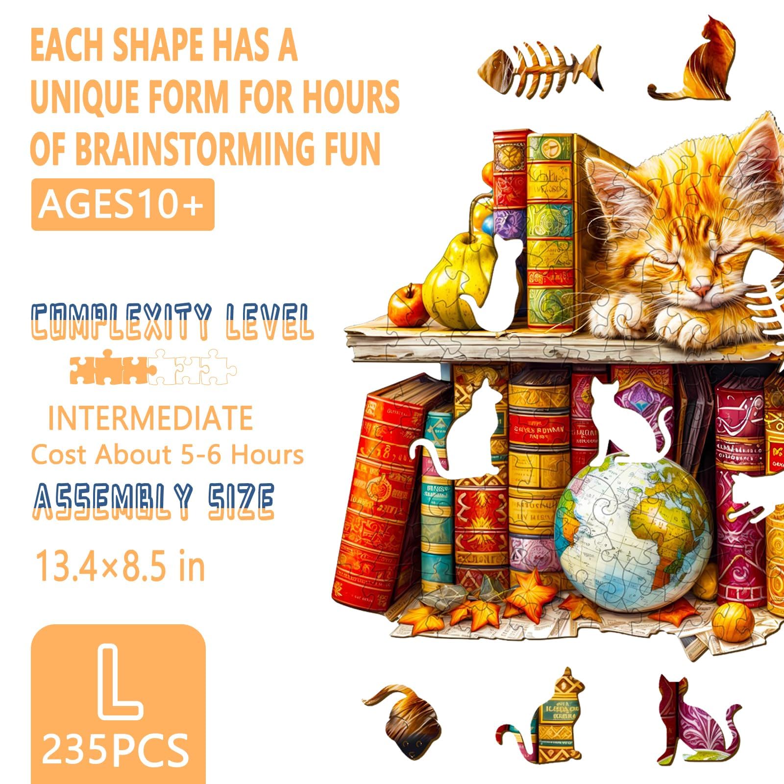 Wooden Puzzles for mature-themeds Dreamy Tabby Cat Wooden Jigsaw Puzzles for mature-themeds Library Kitten Wood Puzzles mature-themed Unique Animal Shape Gifts for Cat Lovers & Friends Home Decor (L-13.4 * 8.5in-235pcs)