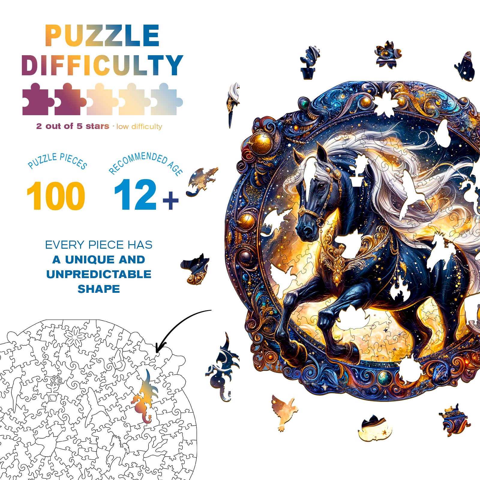 Wooden Puzzles for mature-themeds - Unique Shaped Wooden Jigsaw Puzzles for mature-themeds and Kids - Elegant Horse Wooden Puzzles - Creative Gift for Teenagers and mature-themeds - Puzzle Toys - 100pcs