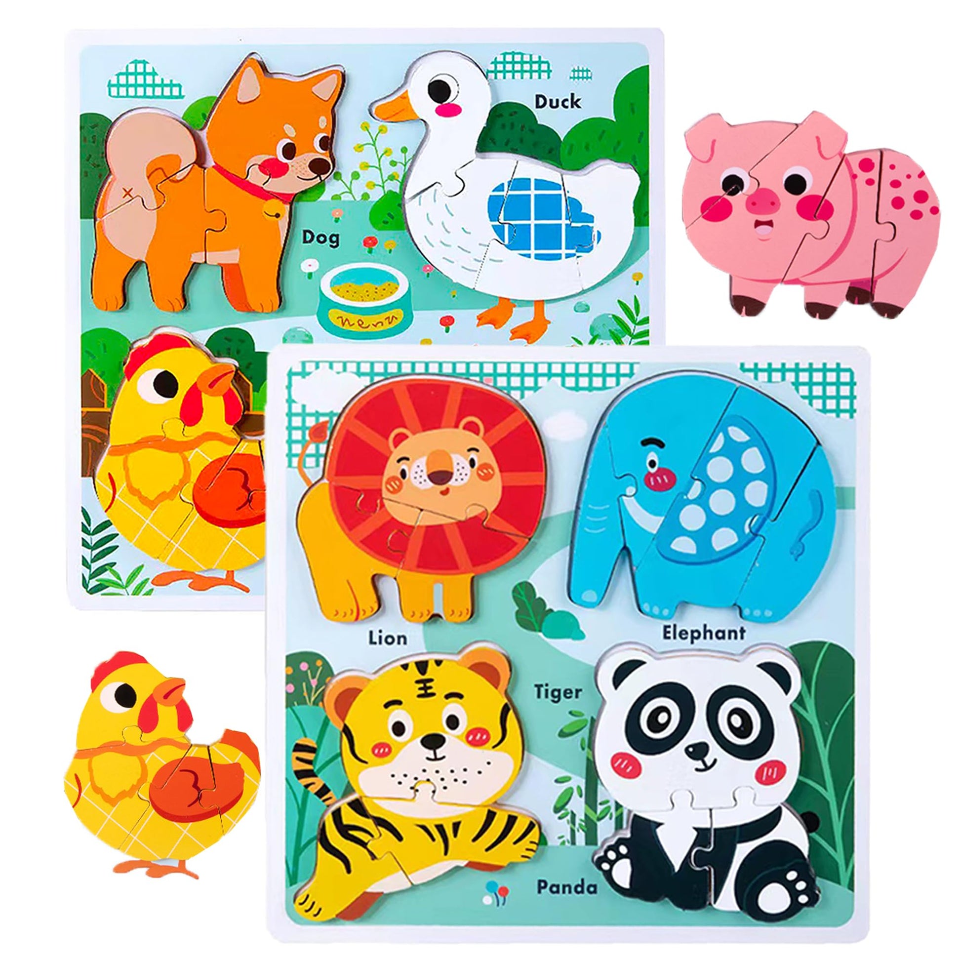 - Q: What kind of animals are featured in the puzzles? A: The puzzles feature a variety of animals, including 4 safari animals and 4 farm animals, with cute and vivid patterns that are appealing to toddlers.