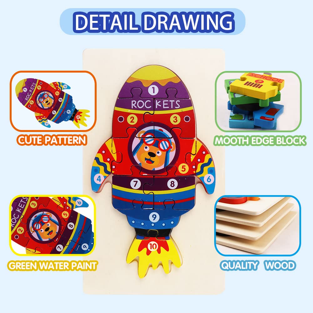 - Q: What themes are included in the set of puzzles? A: The set includes four different transportation themes: a School Bus, Police Car, Excavator, and Rocket, providing a fun and engaging way for children to learn.