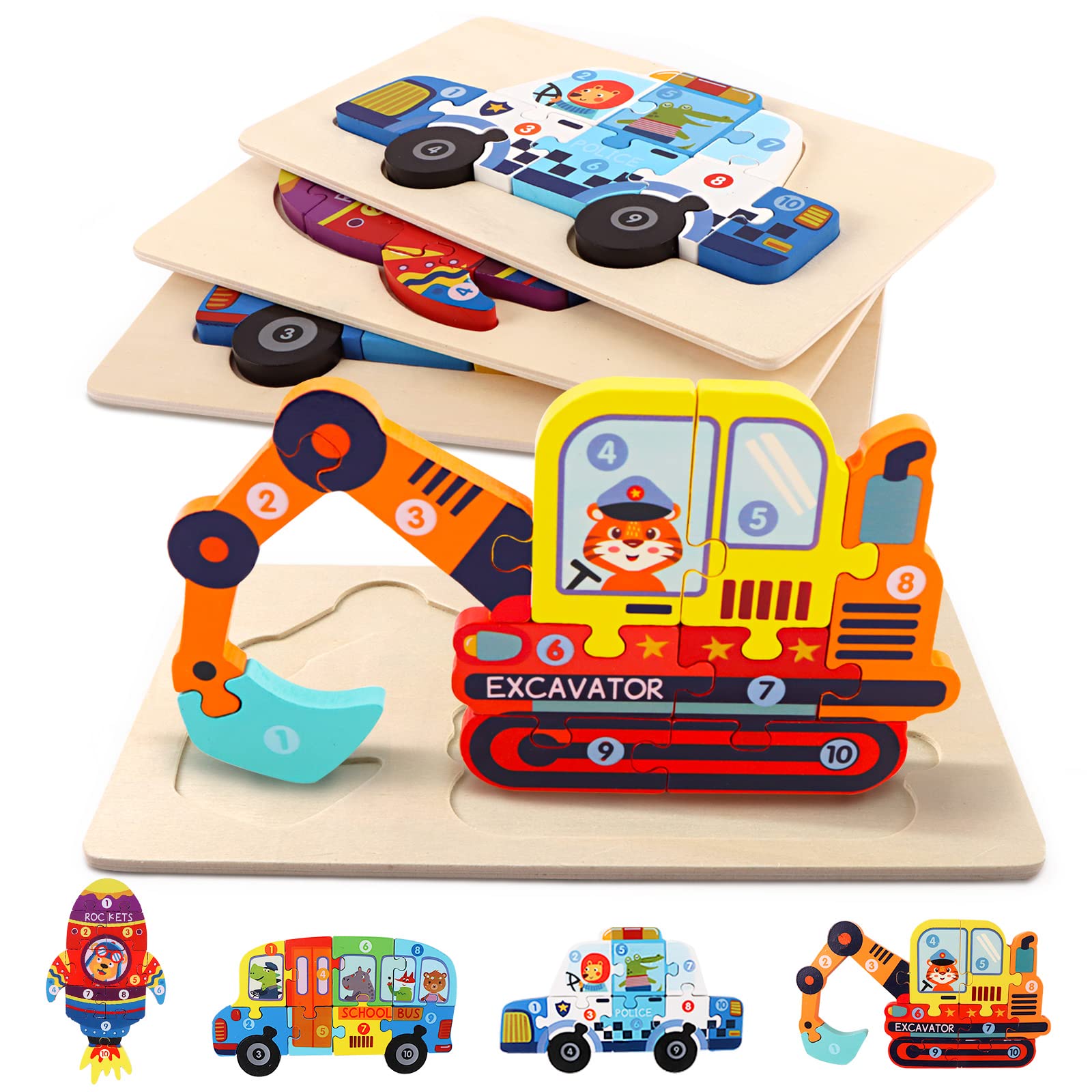 Wooden Puzzles For Toddlers, 4 Pack Wooden Transportation Puzzles Toys Gift For Kids 1-3, Montessori Educational Learning Blocks