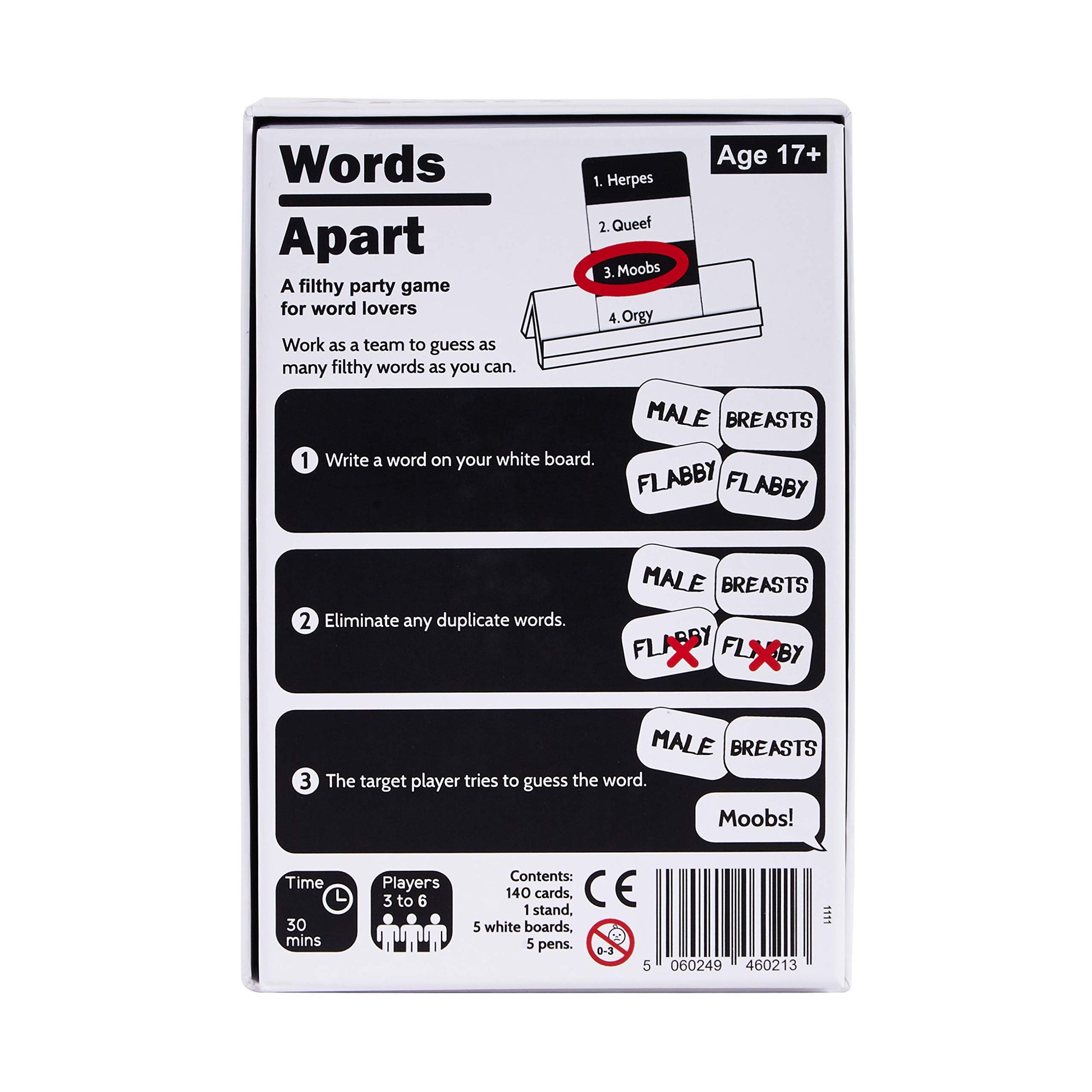 Words Apart: An Outrageous Co-Operative Party Game For Word Lovers: Words Apart Is An Outrageous Party Game That Is Guaranteed To Have You Laughing Out Loud. One Player At The Table Picks A Number That Corresponds To A Word Provided On The Card. On Their Whiteboards, The Other Players Write Down A Single Word Associated With This Word, Providing Clues To The Guesser. Be Careful! Any Duplicated Words On Player Whiteboards Will Be Scrubbed Clean Before The Guesser Sees Them, So Get Inventive. If They Guess The Original Word Correctly, Your Team Will Score A Point. Words Apart Works Best With 3 Or More Players. It Takes 2 Minutes To Learn And 30 Minutes To Play (But Really You Can Play For However Long You Want And, Trust Us, That Will Be A Whole Evening!) Nsfw Adults Only - Ages 17+. 3+ Players, 30 Min