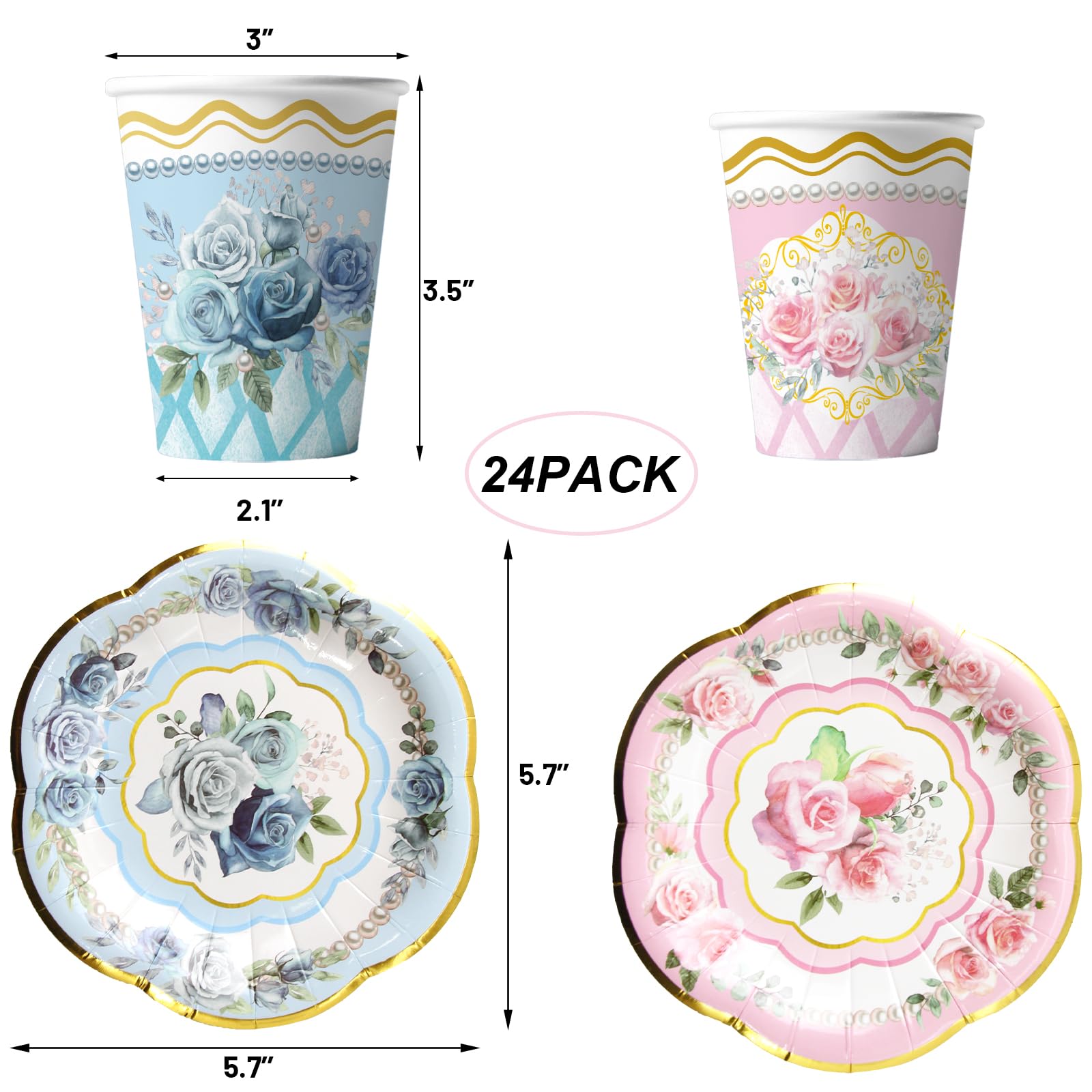 WorldBazaar Tea Party Cups and Saucers 24 Sets Floral Paper Cups with Handles 9oz Tea Party Decorations Flower Birthday Party Su
