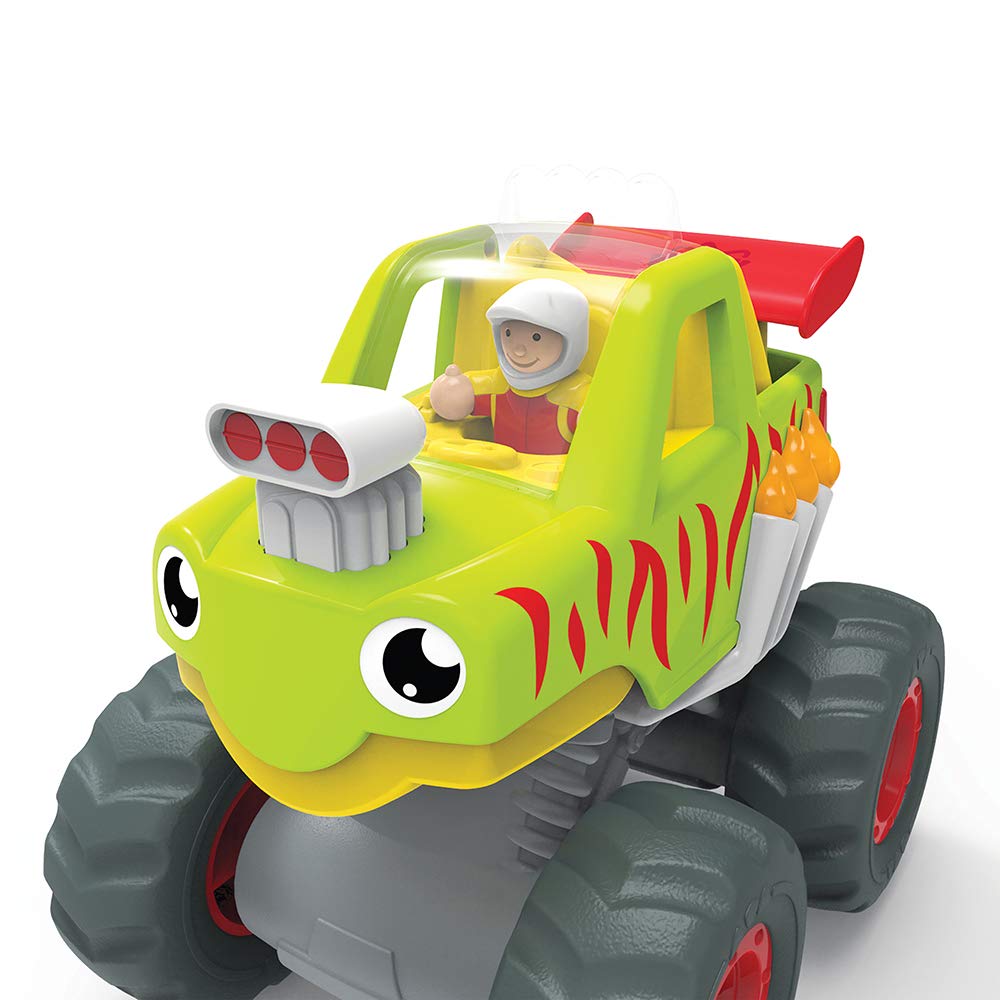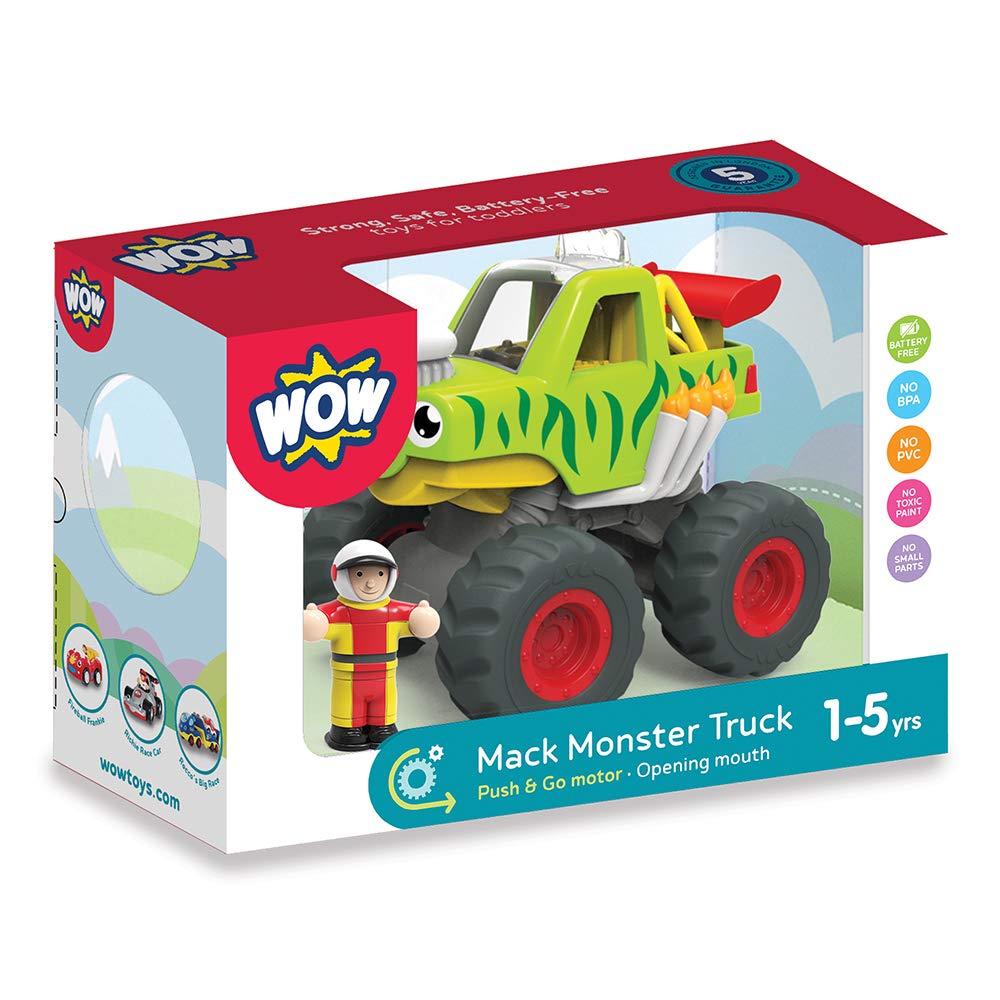 Monster truck mack is a colorful monster truck with realistic engine sounds and oversize rubber wheels from WOW toys. the has a push-down engine that when pushed opens macks enormous mouth to reveal a set of monster teeth coming to get youchildren love playing with monster mack and his scary smile is completely lovable though it may persuade your little ones to brush their teeth regularlymonster truck macks removable friendly driver figure loves to drive his monster truck and he is a sure winner every time Thanks to macks supersized and powerful motorized engine. just flip-up his roof and place the driver figure into his driver seat and wait for it readysteadysetgo mack monster ttruck is a 2 piece set and includes a monster truck and a driver play friend figure.