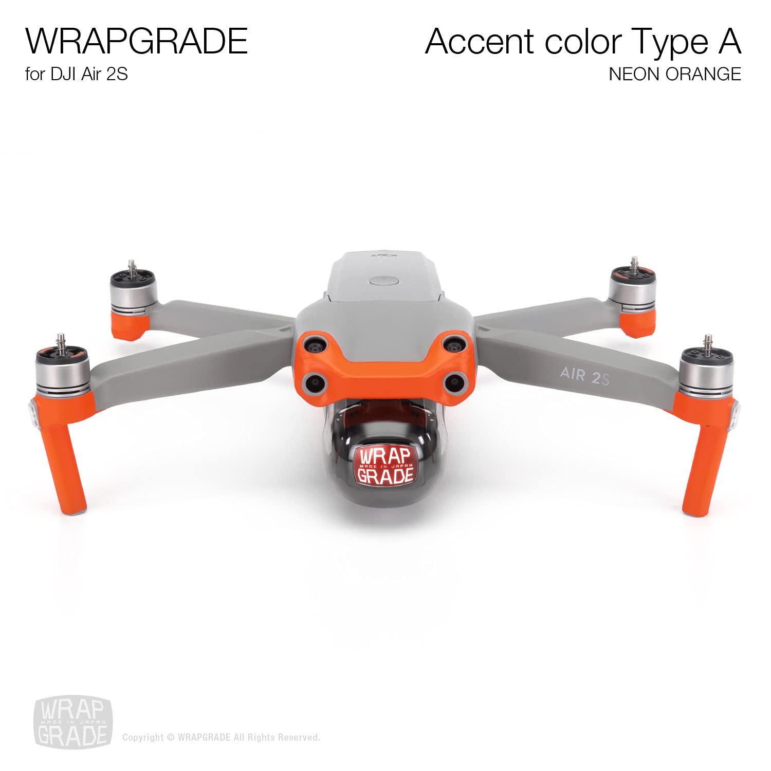 WRAPGRADE for DJI Air 2S was designed based on poly concept. By coloring the head/bottom/arms/controller sides with the Accent Color, visibility improves and become easier to understand the drone's direction during an intermediate-range flight compared to when you fly the original grey colored drone. The Accent Color helps to improve visibility even if the main wrap is dark color. Also, you can enjoy color coordination as you choose. If you use the genuine DJI propeller guards, the arm skin may interfere and cannot attach the propeller guards or the arm skin may get damaged. Please do not use the arm skin or please use the Accent Color B instead.