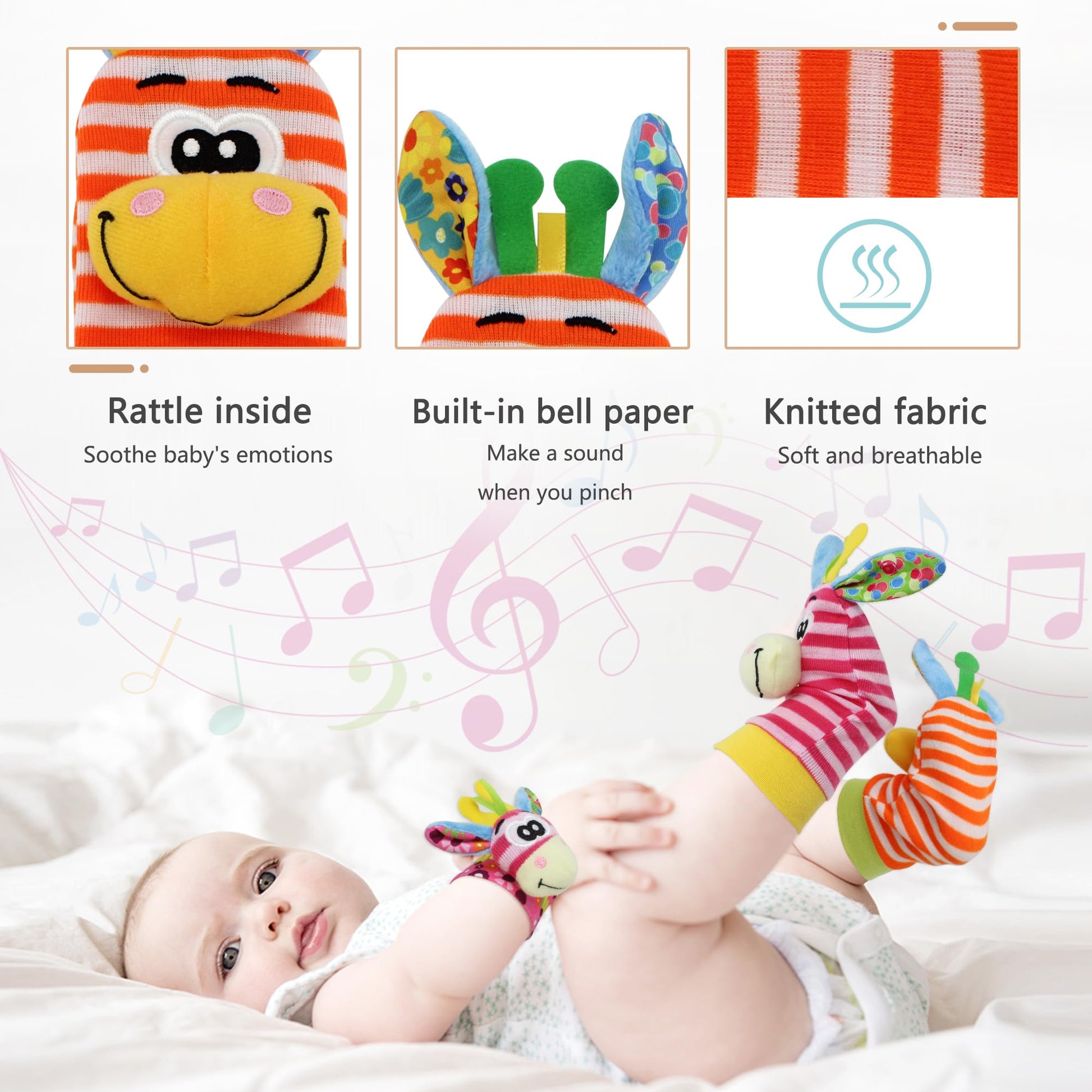 - Q: How can the Wrist Rattle Foot Finder Sock aid in my baby's development? A: This toy set features bells, crinkle paper, and sound makers that stimulate your baby's visual and auditory senses, promote body coordination, and encourage grasping and kicking movements.