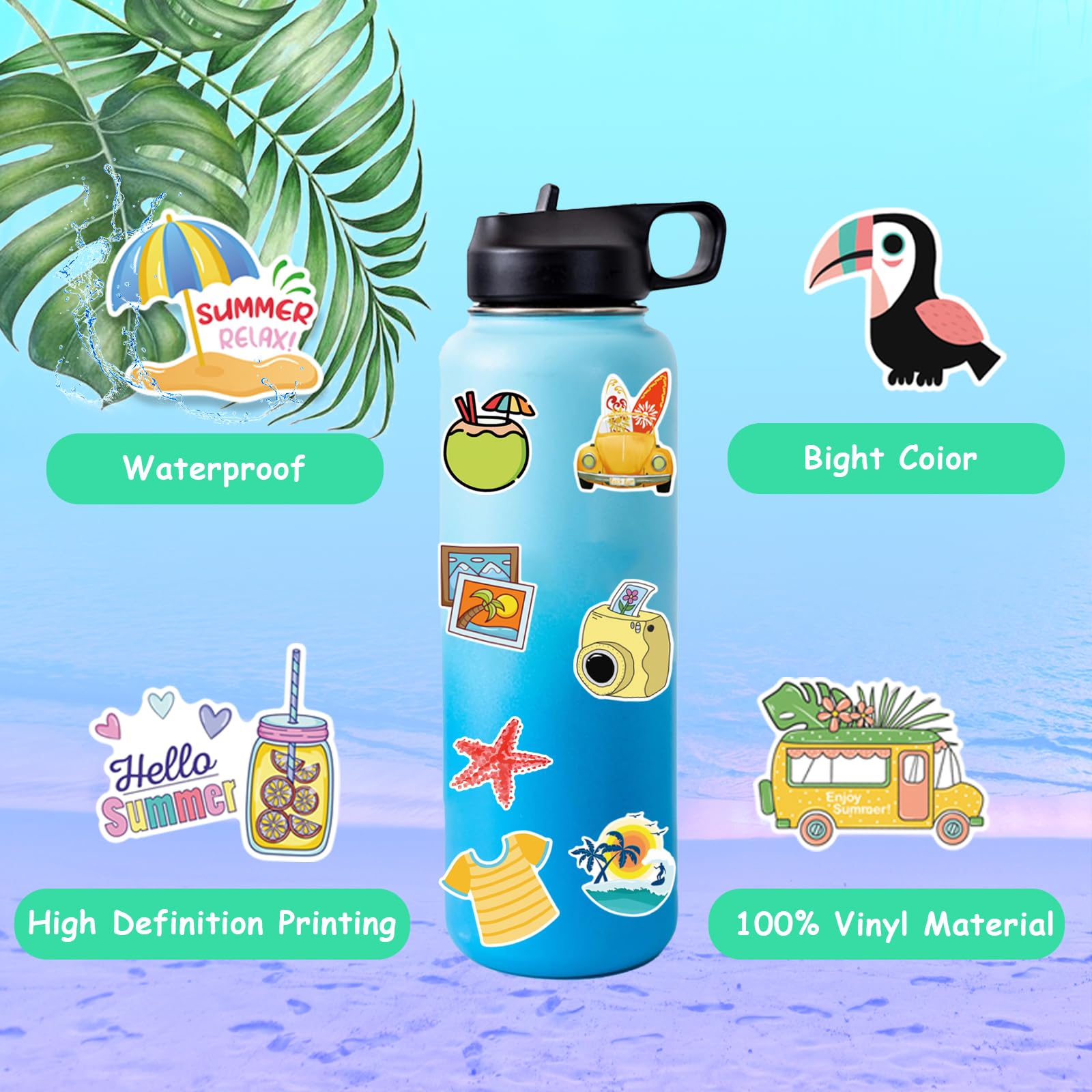 - Q: What themes do the stickers feature? A: The stickers feature various tropical themes, including the sun, watermelon, coconut trees, and swimming rings. They embody a fun summer vibe.
