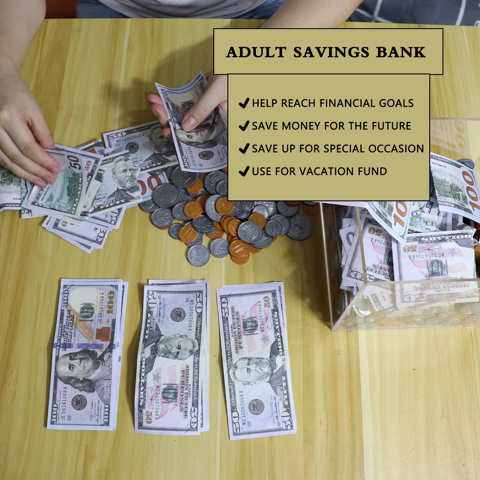 WHY CHOOSE OUR UNOPENABLE DESIGN UNOPENABKLE PIGGY BANK? HELP REACH FINANCIAL GOALS SAVE MONEY FOR THE FUTURE SAVE UP FOR SPECIAL OCCASION USE FOR VACATION FUND Features: 1.enhanced acrylic material: The cash piggy bank is made from highly transparent acrylic material. Our acrylic bank for mature-themeds to save money is more sturdy and safer compared to the fragile glass opaque ceramic and hard-to-open stainless steel piggy bank. The money bank for mature-themeds is easy to break up when the goal is completed. 2.Transparent save money box mature-themeds: Every day you can clearly see how much money you have saved in the clear change bank and fully enjoy the happiness of money growth. 3.Large Capacity: SIZE: 6.3 * 6.3 * 6.3 inches. Capacity: 4 Quart = 1 Gallon = 16 Cups = 128 Fluid Ounces. The slot is sized for all US coins cash and bills. The clear piggy bank for mature-themeds can store about 1800 coins and 750 banknotes. 4. No Piggy Bank Plug Stopper Design: The save money box is completely closed with only a thin cut You can put cash and change. it is recommended to open it only when the goal is completed or in some emergency situations. Because You can only retrieve the money by destroying the piggy bank coin piggy bank saving jarsafe. 5.Piggy Bank For Everyone: The clear acrylic tip jar is suitable for children teens mature-themeds elderly boys or girls. 6.Meaningful Gifts: The acrylic piggy bank for mature-themeds is a meaningful and functional gift for mature-themeds or kids. the acrylic change jar also is a simple and beautiful house desktop decoration. HOW TO GET THE MONEY OUT?: Wrap the bank jars for money in a towel to keep clutter from getting all over the place. Hit on the corner with a hammer. Retrieve money. Product Properties: Material: Acrylic Color: Transparent Size: 6.3 * 6.3 * 6.3 inches Product Contains: ?1 x piggy bank for mature-themeds