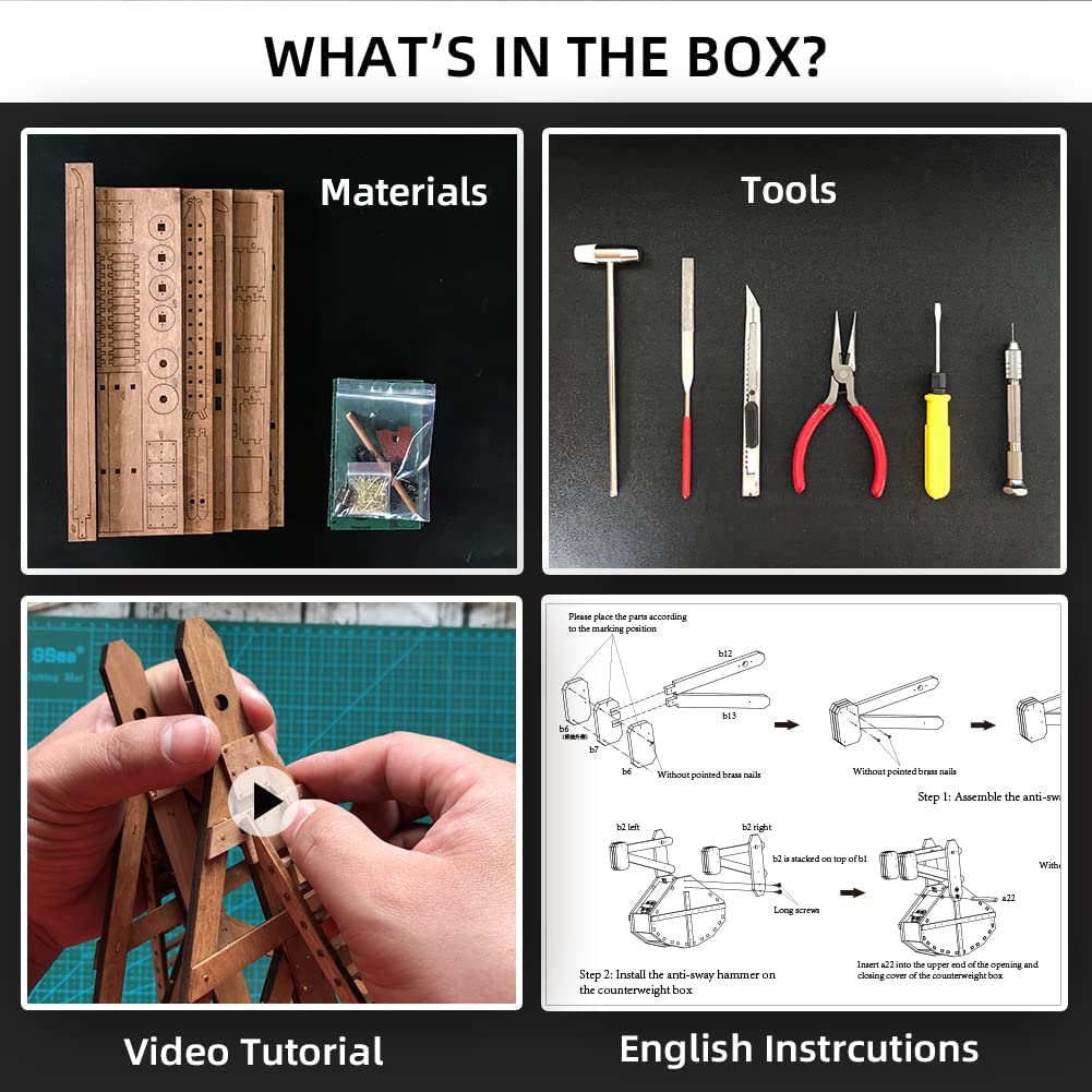 This new counterweight rock thrower which is designed and developed by shujule has been improved so that it is easier to assembleThe counterweight rock thrower appeared in the medieval siege warfare. The most prominent feature is that the lifting runner is located at the front of the body so it is also called the front runner rock thrower. This layout makes the rear slide of the fuselage clean and smooth which is more conducive to stone projectile installation and projectile. The counterweight rock thrower uses the principle of leverage. There is a heavy object on one end and a stone to be launched on the other end. Before launching the end where the stone is placed must be pulled down with a winch and the other end with the heavy object is also rising at this time. Let go of the rope let one end of the heavy object fall and the stone projectile was thrown. Features:.Precision cutting error control within 5 microns excellence.Applicable Age: 14 years old or olderSpecifications:.Color: As Shown.Material: Wood.Product Dimensions: 38 x 20 x 21cm.Product Weight: 600g.Package Dimensions: 27 x 17 x 5cm.Package Weight: 700g.Packing: Carton BoxPackage Content:.1 x Ancient Chariot DIY Model kits .1 x English manual .1 x toolset