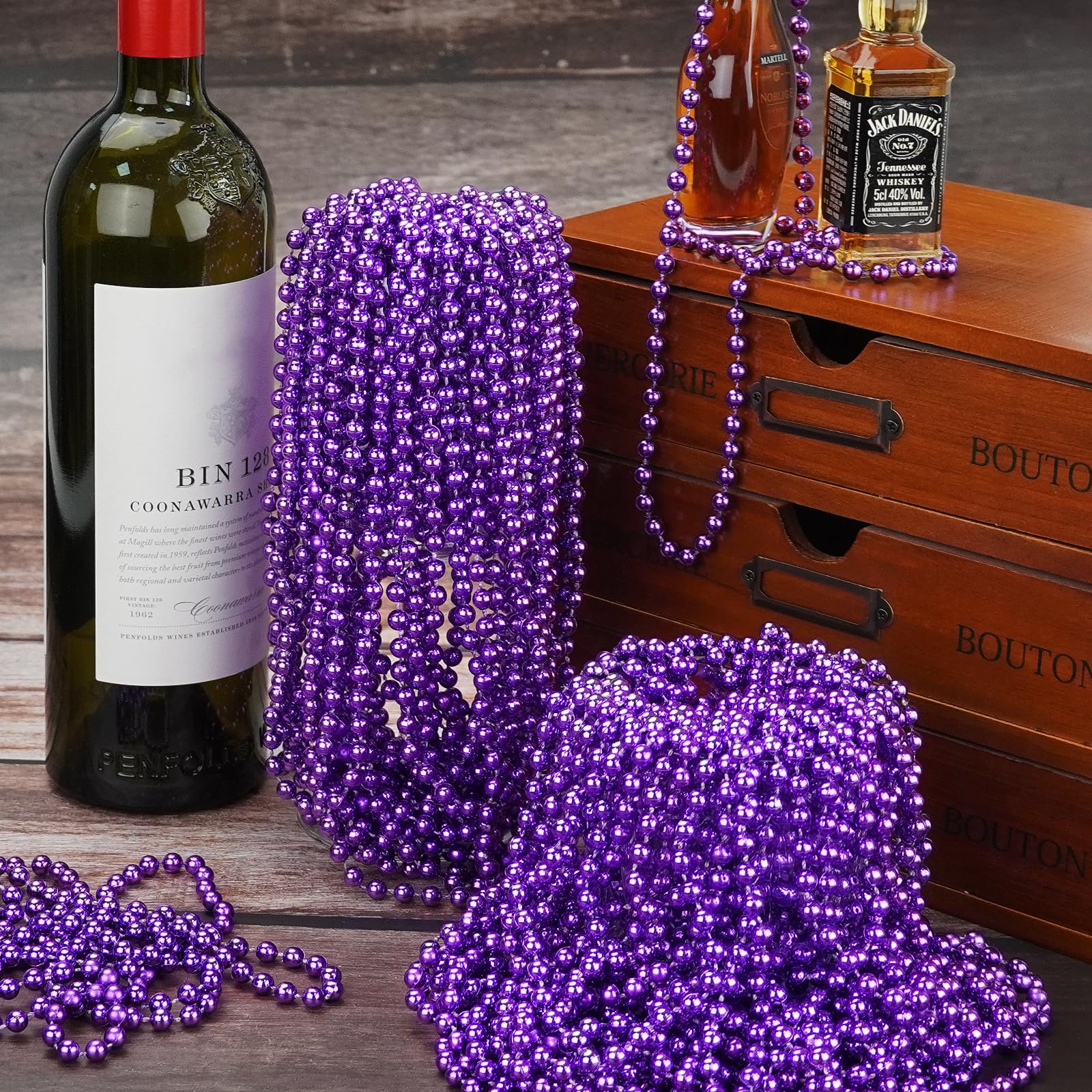 - Q: How long are the purple bead necklaces? A: Each purple bead necklace measures 33 inches in length. This size makes them suitable as wearable decorations that can easily be worn around the neck or used creatively for table and vase ornaments.