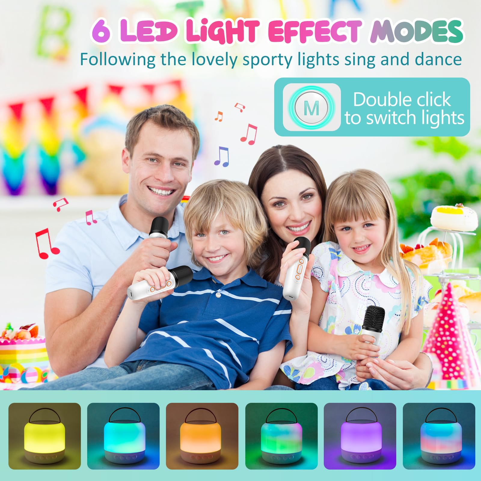 - Q: What sound effects are available on the YENLOVE Mini Karaoke Machine? A: The karaoke machine comes with 4 interesting voice-changing effects, including male, female, children's, and monster voices, adding fun and creativity to your karaoke sessions.