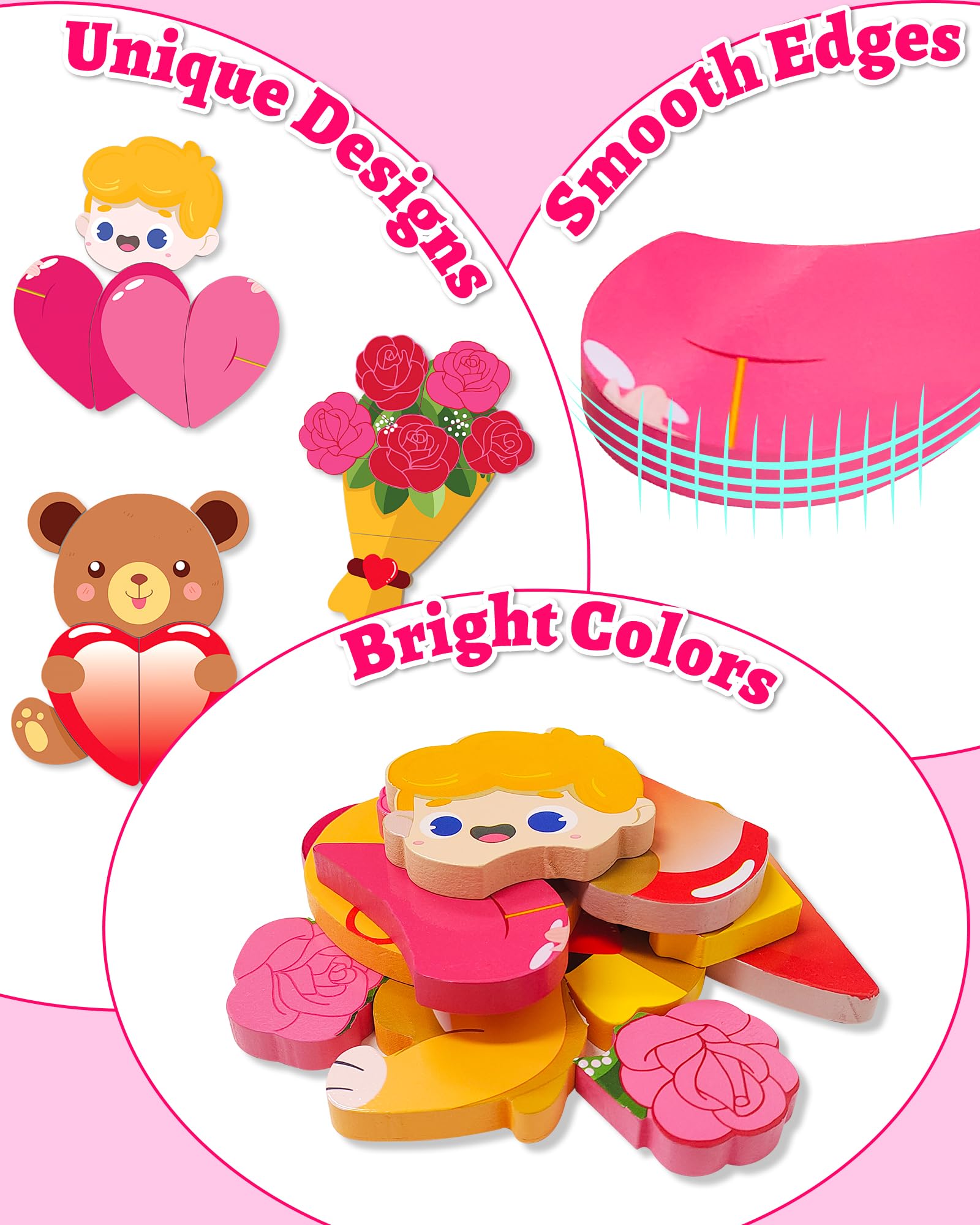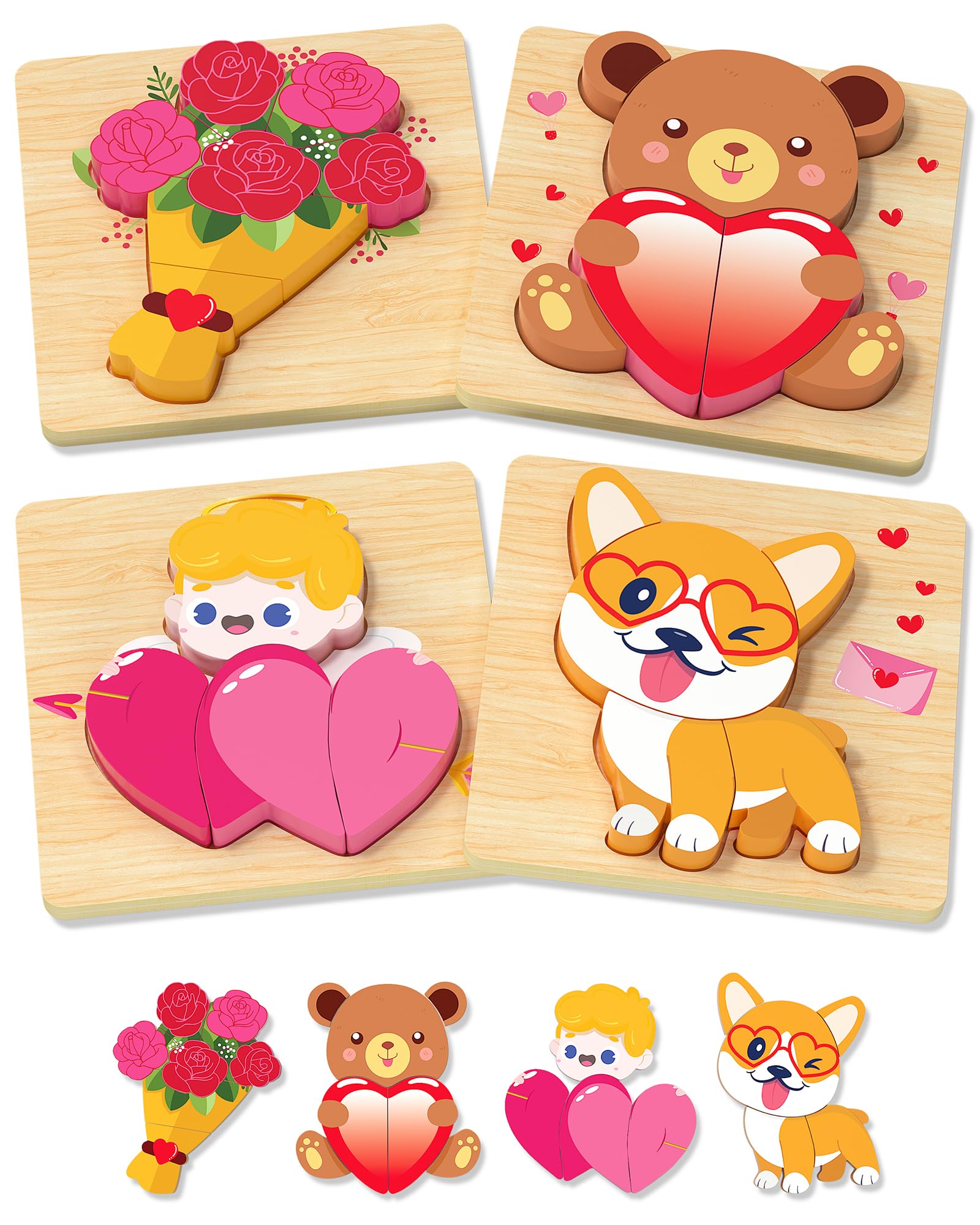Yetonamr Valentines Wooden Puzzles Gifts For Kids, 4 Pack Toddler Valentines Day Toys For Boys Girls, Valentines Gifts For Kids Classroom, Montessori Toys Valentines Day Party Favors