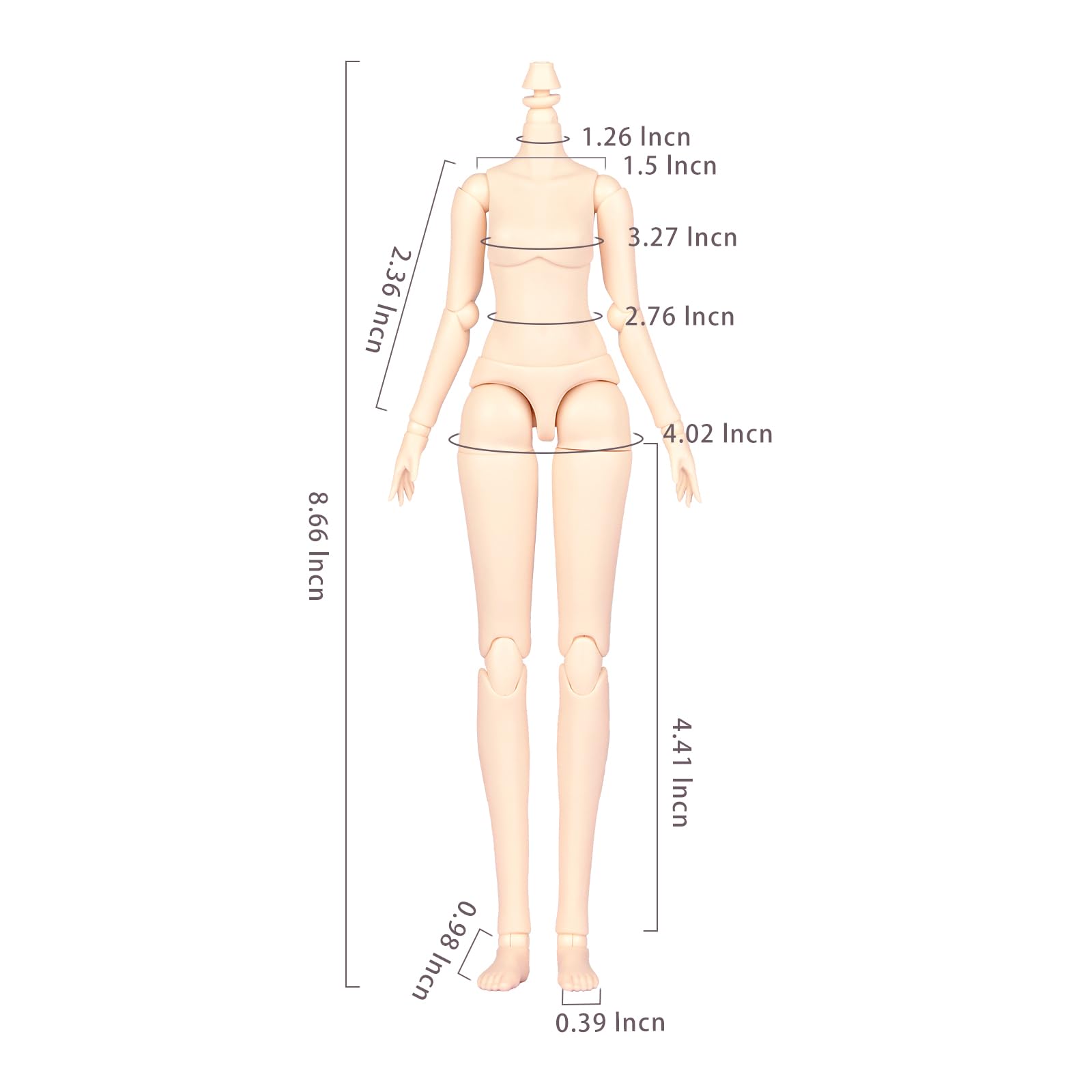 The doll is about 8.66 inches tall, please refer to the picture for specific size.Since the size is measured manually, there may be some errors | packaging list:1 body, 3 pairs of spare hands, 1 face support, big chest replacement parts, 1 BJD neck clip, 1 screwdriver; YMY22 forearm, thigh, and calf | The doll body can be adapted to GSC head,Ob11 head, bjd , Licca, Blyth, Parabox, Azane, Ruruko and YMY doll head | The movable doll can rotate at each joint and has a magnet on the bottom of its foot that can be attached to a magnet sheet | If you have any questions, please contact us,Depending on the monitor environment, the color of the product may differ slightly from the photo