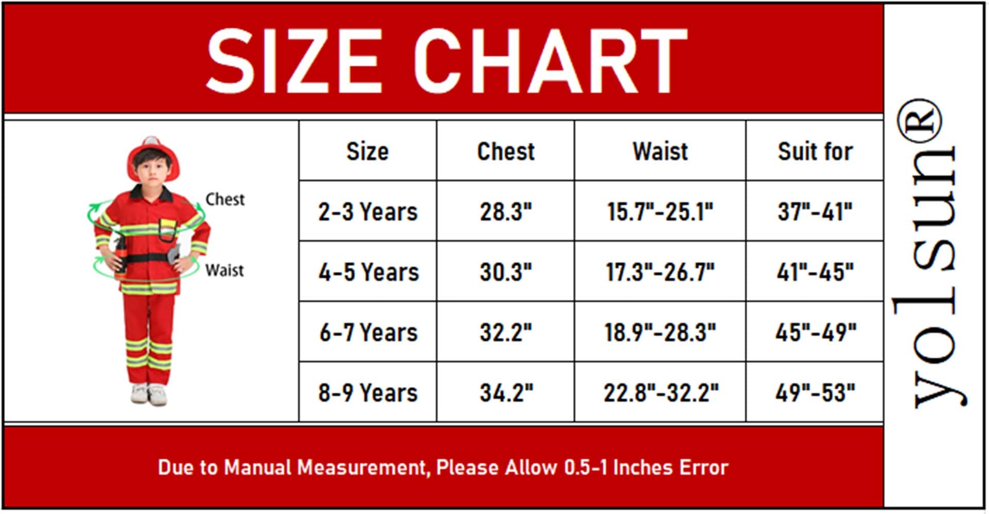 - Q: Is the yolsun Fireman Costume appropriate for all children? A: Yes, it is designed for both boys and girls aged two to ten years.