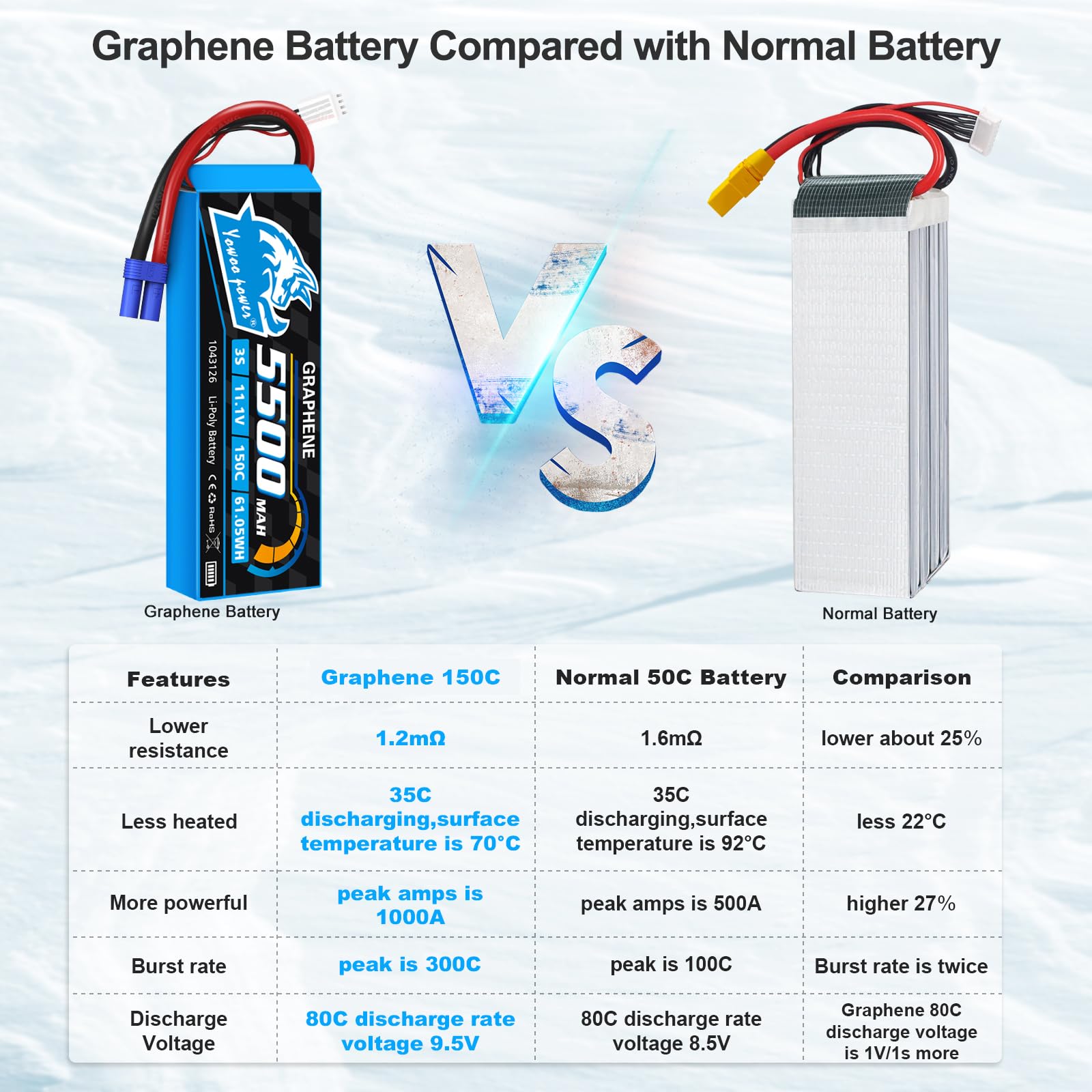 - Q: What advantages do Graphene Batteries offer compared to traditional Lipo batteries? A: Graphene Batteries, like the Yowoo 3S Lipo, offer higher energy density, allowing for more electrical energy storage in a compact size. They also provide faster charging speeds and improved safety due to better heat dispersion, reducing the risk of overheating, leakage, and explosion compared to traditional Lipo batteries.