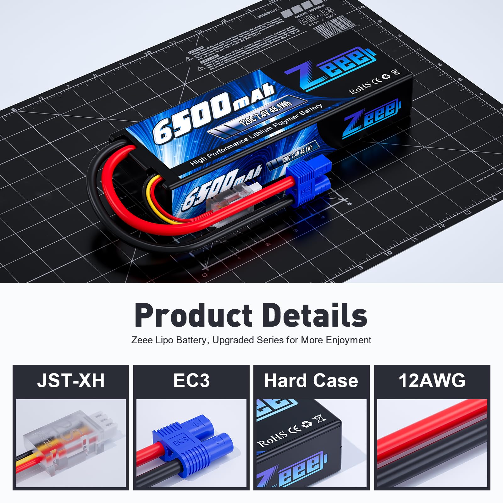 Zeee is a professional brand specializing in the research, development, production, and sales of Li-polymer rechargeable batteries. Features - Lightweight, long cycle life, no memory effect. - High power battery, high capacity provide your rc model more energy, more enjoyment. - High Discharge rate and steady discharge curve make your rc vehicle work powerfully. Specification Brand: Zeee Capacity: 6500mAh Voltage(V): 7.4V Discharge Rate (C): 120C Configuration: 2S1P Connector Type: EC3 Plug Dimension: 138*47*25mm/5.43*1.85*0.98inch(L*W*H) Approx Weight(10g): 285g/10.05ozCompatible RC Models - Zeee 2S 6500mAh Lipo Battery special designed for professional 1/10 scale and 1/8 scale RC car hobby models such as: Slash, Bandit, Rustler version, Losi, Team Associated, etc. - It also could be used for RC airplane, RC helicopter, RC boat, drone, FPV, only if the voltage, weight, dimension and plug match. Package Including 2 Pack of Zeee 7.4V 120C 6500mAh Lipo Battery with EC3 plug Attention -For the RC battery, only if the voltage and the plug match, then it will fit. -Please stop charging immediately when the cell voltage been charged to 4.2v (Normal cell voltage is between 3.2v~4.2v). -To double make sure safety, please have a check first whether the battery surface is alright when you get it and whether the voltage is normal before using. - If the new battery wont hold a full charge or loss the charge very quickly in short time, please use Balance Charger to charge and recycle several times first.