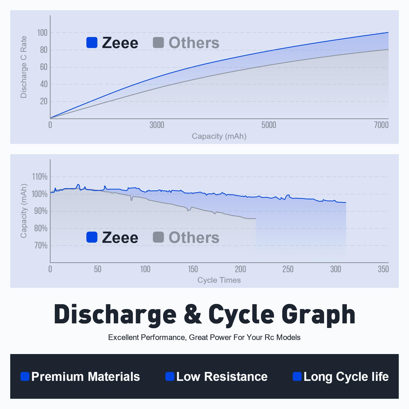 Zeee is a professional brand specializing in the research, development, production, and sales of Li-polymer rechargeable batteries. Features - Lightweight, long cycle life, no memory effect. - High power battery, high capacity provide your rc model more energy, more enjoyment. - High Discharge rate and steady discharge curve make your rc vehicle work powerfully. Specification Brand: Zeee Cell Number: 3S Voltage(V): 11.1V Capacity(mAh): 2200mAh Discharge Rate (C): 50C Charge Plug Type: JST-XH Discharge Plug Type: T plug Battery Dimension(2mm): 75*34*26.5mm/2.95*1.34*1.04inch(L*W*H) Approx Weight: 137g/4.83oz Compatible RC Models Zeee 3S 11.1V 50C 2200mAh rc lipo battery compatible with 1/10 rc car, rc truck, rc vehicles, rc helicopter, plane, airplane, FPV (Only if the voltage, dimension, and the plug match, then it will fit) Attention 1. Lipo batteries are potentially hazardous. Improper usage can cause fire or explosion 2. Please use Professional lipo battery charger. 3. NEVER Over-charge or Over-discharge lipo battery. 4. Please stop charging immediately when the cell voltage been charged to 4.2v (Normal cell voltage is between 3.2v~4.2v). 5. If the new battery wont hold a full charge or loss the charge very quickly in a short time, please use Balance Charger to charge and recycle several times first.