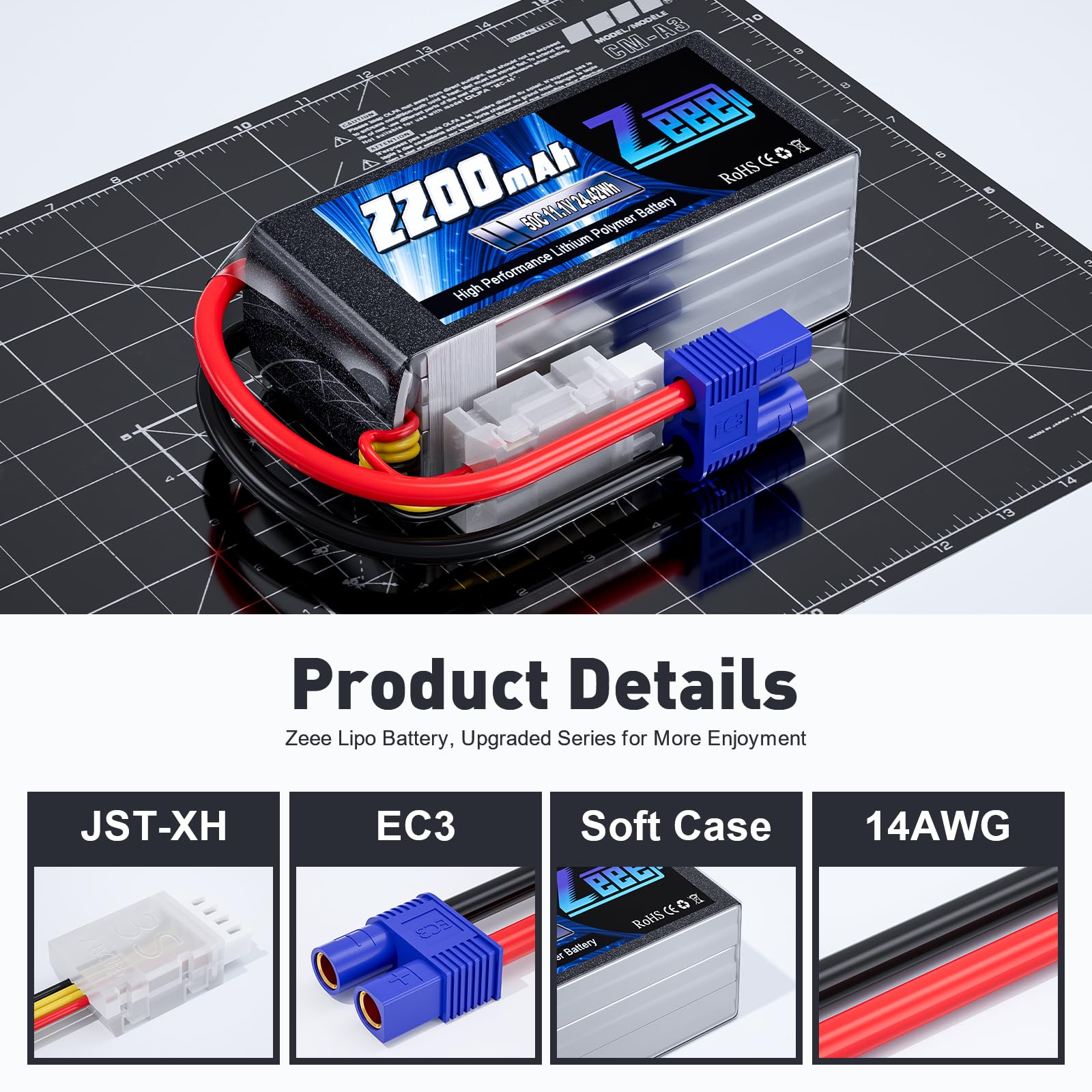 - Q: What is the discharge rate of the Zeee 3S 2200mAh battery, and why is it important? A: The Zeee 3S 2200mAh battery has a discharge rate of 50C. This high discharge rate is crucial for providing the necessary power and performance to your RC models, ensuring they operate efficiently and effectively during high-demand situations, such as racing or heavy lifting.