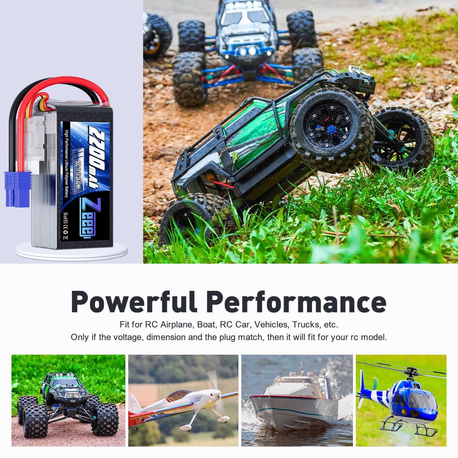 - Q: What types of RC vehicles is the Zeee 3S Shorty Lipo 2200mAh battery compatible with? A: The Zeee 3S 11.1V 50C 2200mAh Lipo battery is compatible with various RC vehicles including 1/10 scale RC cars, trucks, boats, helicopters, airplanes, and FPV drones, provided that the voltage, dimensions, and connector type match.