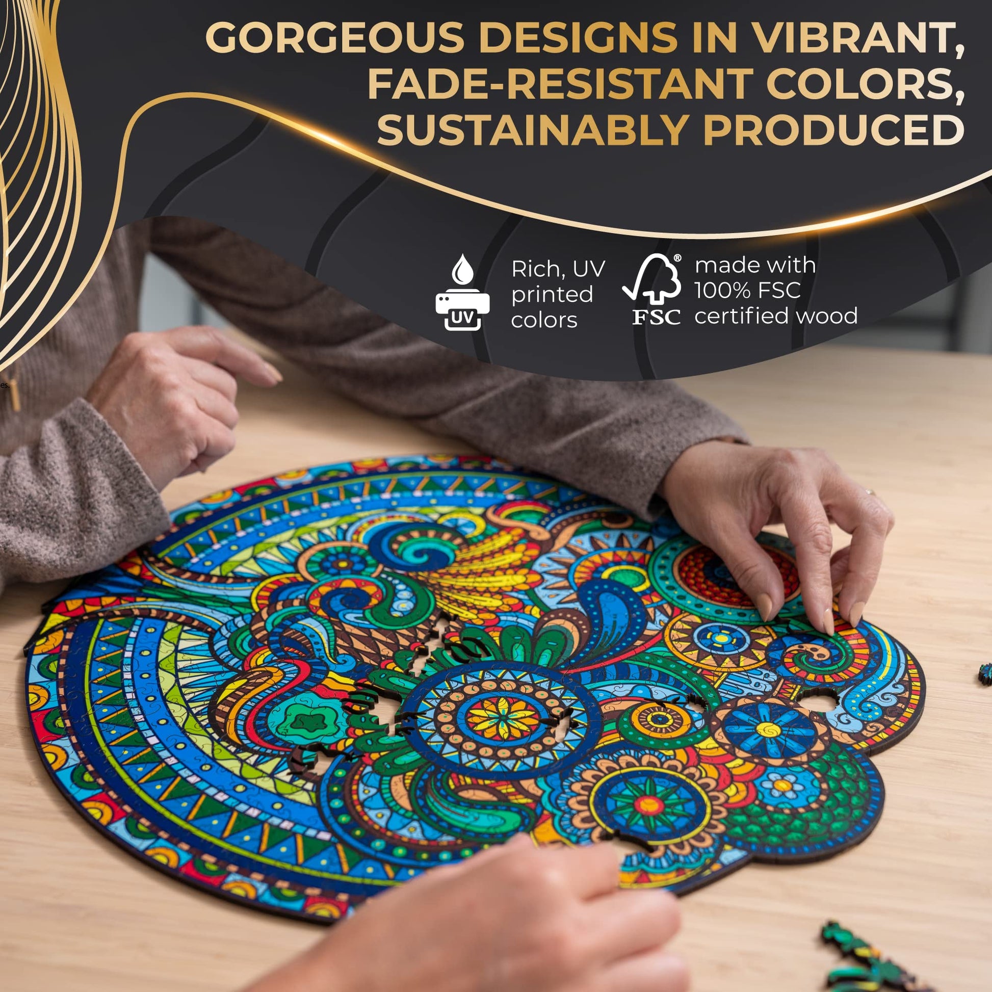 • Q: What materials are used in the construction of this puzzle? A: The ZenChalet Floral Retro Jigsaw Puzzle is crafted from 100% FSC certified wood, ensuring that it is both sustainable and environmentally friendly. The UV printed pieces are also fade-resistant, promoting durability for repeated enjoyment.